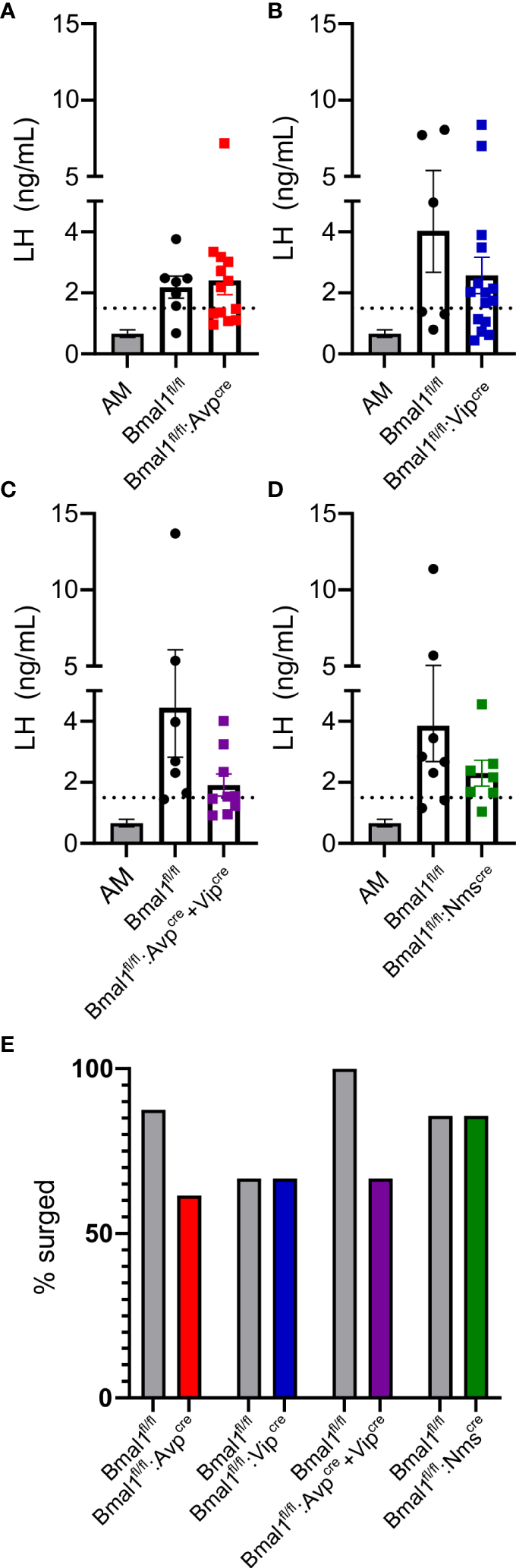 Bmal1 mutants demonstrate an appropriately timed LH surge. LH levels at ZT12 for (A)Bmal1fl/fl:Avpcre (n = 7-12), (B)Bmal1fl/fl:Vipcre (n = 6-15), (C)Bmal1fl/fl:Avpcre+Vipcre (n = 7-9), and (D)Bmal1fl/fl:Nmscre (n = 7-8) mice. AM levels from mice across multiple genotypes and cohorts are plotted for comparison (same in each graph); dashed line represents surge cutoff at two standard deviations above the AM values. For all cohorts, ZT12 LH levels were significantly greater than AM levels, and there was no difference between the control and mutant populations (one-way ANOVA, Tukey’s multiple comparison’s test). (E) Percentage of animals above surge cutoff in each genotype (not significant by Fisher’s exact test).