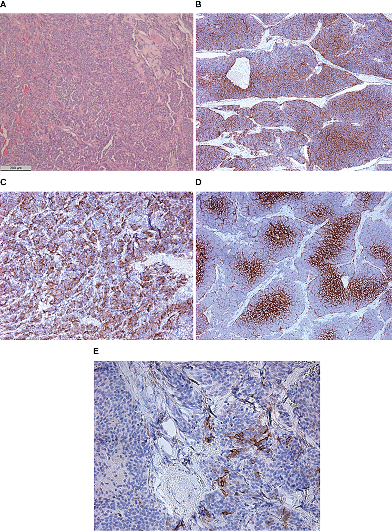 Histological and immunohistochemical examination of primary neuroendocrine tumor of the left ovary. (A) Hematoxylin and eosin staining ×50. (B) CD56 ×50. (C) ACTH ×50. (D) GLUT-1 ×100. (E) SSTR 5 subtype ×200.