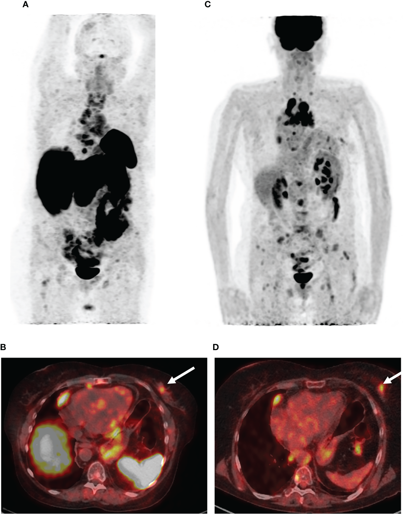 PET/CT images with [68Ga]-DOTA-TATE and [18F]-FDG. (A) The maximum intensity projection (MIP) images summarize the physiological and pathological distribution of [68Ga]-DOTA-TATE in the body. PET/CT scan showed an increase in the size of the previously detected metastases and the appearance of a new mediastinal lymph node and bone metastases. (B) [68Ga]-DOTA-TATE. PET/CT revealed an avid metastatic lesion in the upper inner quadrant of the left breast (white arrow). (C) The MIP images of [18F]-FDG PET showed intense tracer uptake in the same area as the [68Ga]-DOTA-TATE PET/CT scan. (D) [18F]-FDG-positive metastatic lesion in the left breast (white arrow).