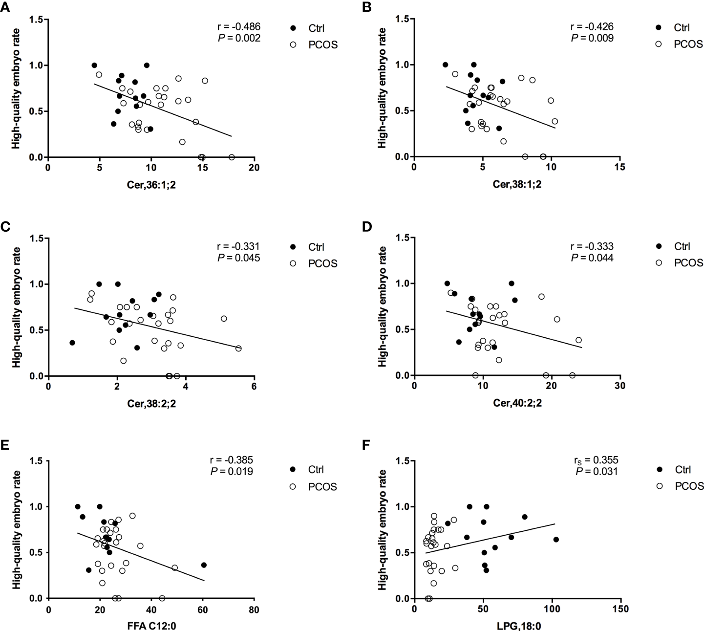 To further evaluate the potential interferences between FF lipid levels and oocyte quality in PCOS, the correlations between the levels of specific lipids and HQER were assessed. Six lipid subclasses were found to be highly correlated with oocyte quality using the Pearson or Spearman correlation tests in women with and without PCOS (Figure 2). Further linear regression analysis confirmed that the FF concentrations of Cer,36:1;2 (rs = –0.486, P = 0.002), Cer,38:1;2 (rs = –0.426, P = 0.009), Cer,38:2;2 (rs = –0.331, P = 0.045), Cer,40:0;2 (rs = –0.333, P = 0.044), and FFA C12:0 (rs = –0.385, P = 0.019) were significantly negatively associated with HQER (Figures 2A–E). Conversely, the levels of LPG,18:0 in FF showed a significantly positive correlation with HQER (rs = 0.355, P = 0.031; Figure 2F). We also found that the FF levels of differential lipids were closely correlated with the endocrine-metabolic parameters (Supplementary Table 2).