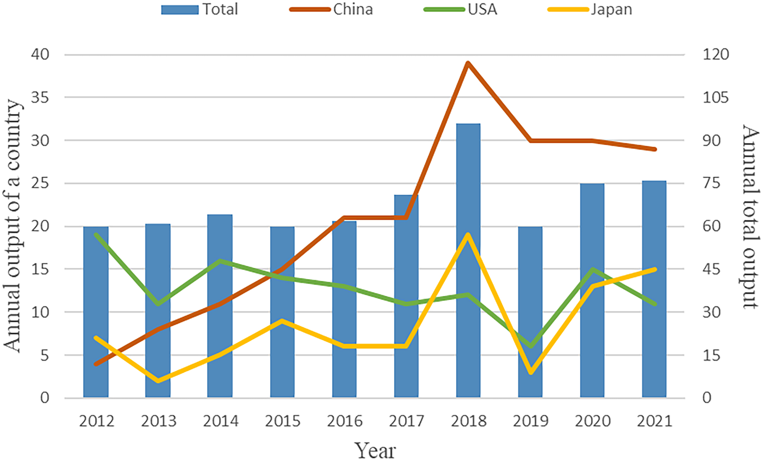 A total of 685 publications were found after removing duplications. As shown in Figure 1, the number trend of annual global publications related to GIOP remained relatively steady overall in the past decade, with 60 or more publications per year. However, there was a sudden and noticeable spike in 2018 with 96 published articles. As for the annual output of the three most productive countries (China, the USA and Japan, which will be illustrated below), China showed the most significant overall growth, ranking first in the annual output since 2015 and reaching its peak in 2018. The number trend of Japanese publications also showed an overall increase in the past decade with a peak in 2018. In contrast, this trend of the USA was fluctuating. These results indicate that the research trend of GIOP varies greatly among different countries.