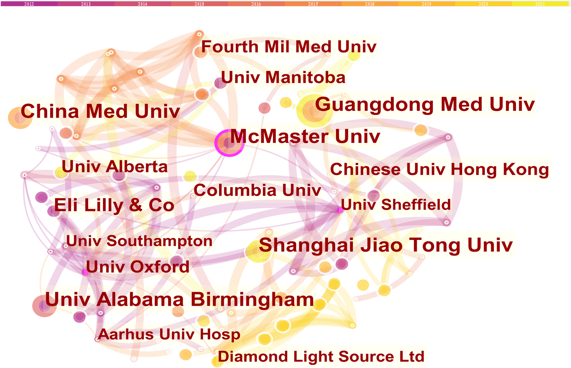 The co-institution network map is shown in Figure 3, with 309 nodes and 660 links. The top 3 prolific institutions were McMaster University, Shanghai Jiao Tong University and China Medical University (Table 3). In terms of centrality, McMaster University, University of Sheffield, and University of Oxford were the top 3 institutions. McMaster University had both the most publications with 12 papers and the highest centrality at 0.17.