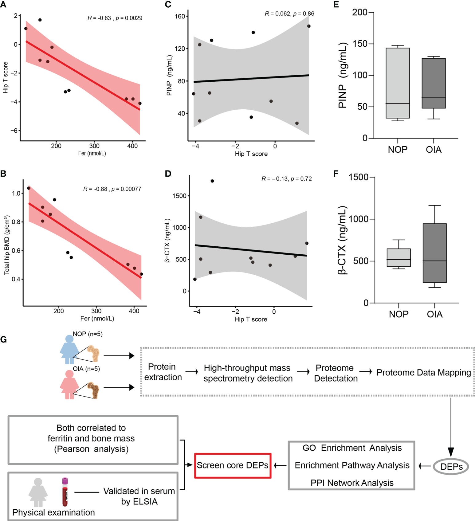 Correlation analysis of clinical index, proteomic analysis workflow. (A) Pearson correlation analysis of hip T score and serum ferritin. (B) Pearson correlation analysis of total hip bone mineral density and serum ferritin. (C) Pearson correlation analysis of serum PINP and hip T score. (D) Pearson correlation analysis of serum β-CTX and hip T score. (E) Serum PINP level of patients from Group NOP and OIA. (F) Serum β-CTX level of patients from Group NOP and OIA. (G) Workflow for quantitative mass spectrometry profiling.