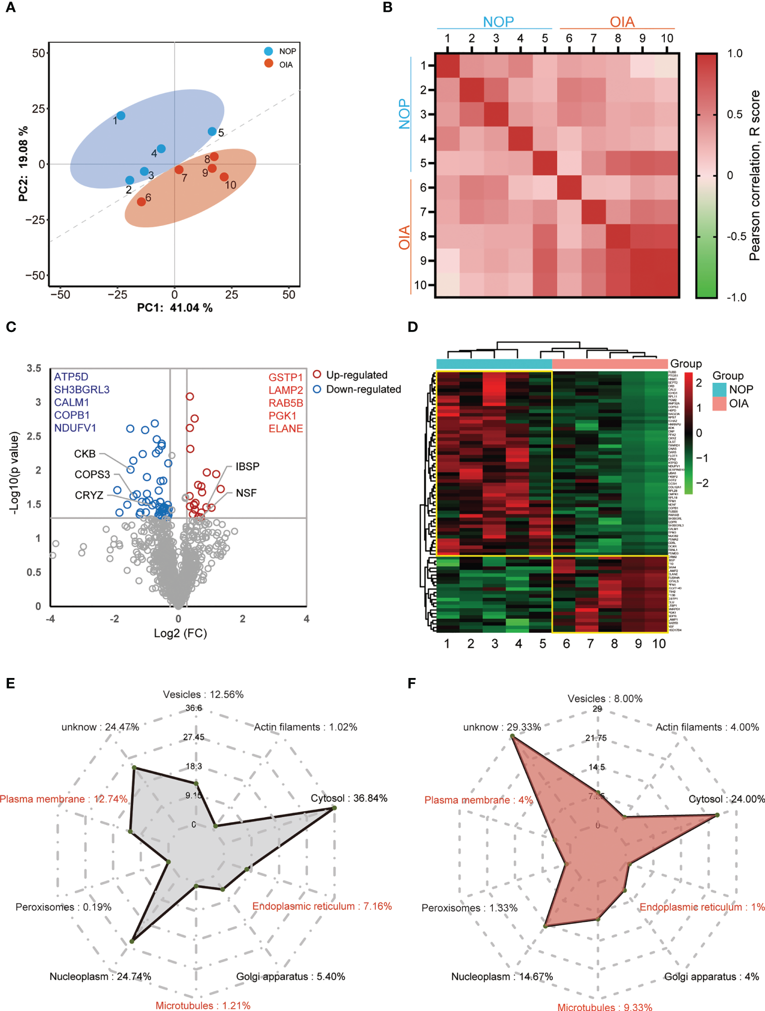 Quantitative proteomics analysis of human bone from osteoporosis patients with iron accumulation. (A) Principal component analysis (PCA) plot showing unsupervised clustering among the 10 samples, demonstrating clear distinction between two Groups. (B) Pearson correlation analysis of proteomic data from 10 samples. (C) Volcano plots comparing bone proteome of Group NOP and OIA. (D) Heatmap and cluster of the differentially expressed proteins. (E, F) Subcellular localization chart of NDEPs (E) and DEPs (F). The amount of protein in each section is expressed as a percentage.
