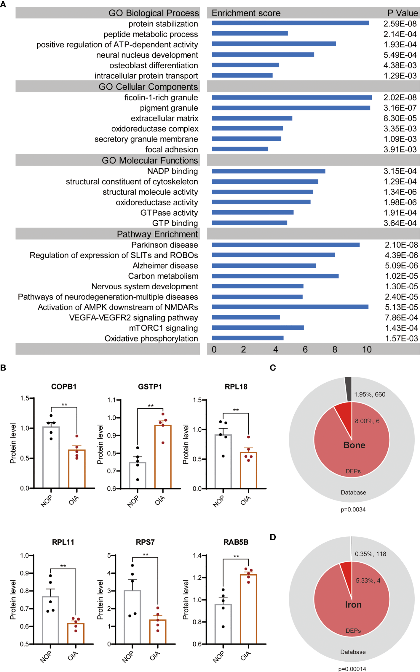 GO terms and pathway enrichment analyses of DEPs between OIA and NOP samples. (A) GO and pathway analysis of the 75 DEPS. (B) Changes in 6 top enriched proteins of GO terms in the osteoporosis with iron accumulation. (C) Membership analysis of DEPs associated with bone metabolism. (D) Membership analysis of DEPs associated with iron metabolism. **P<0.01.