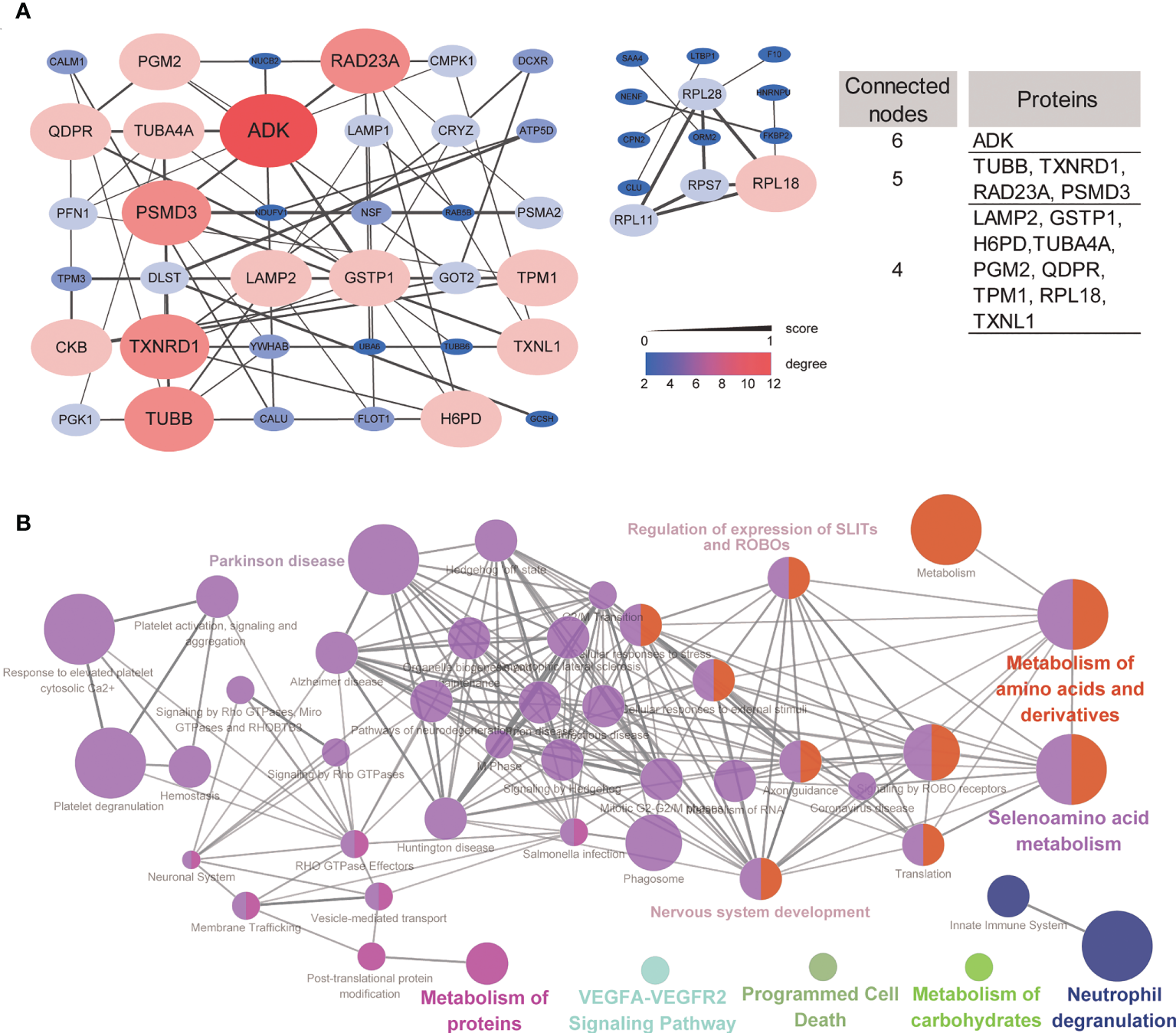 To understand the potential interactions between differentially expressed proteins, a PPI network was constructed. Based on STRING predictions, we found that these differentially expressed proteins had multiple interactions and two clusters in the network were discovered, and these clusters were mainly associated with proteasome and nervous disease. Construction of two PPI networks revealed 49 nodes and 65 edges. 14 DEPs, such as ADK, PSMD3, LAMP2 and GSTP1 have higher degrees than the other nodes in the PPI network suggesting these are hub proteins in DEPs (Figure 4A).