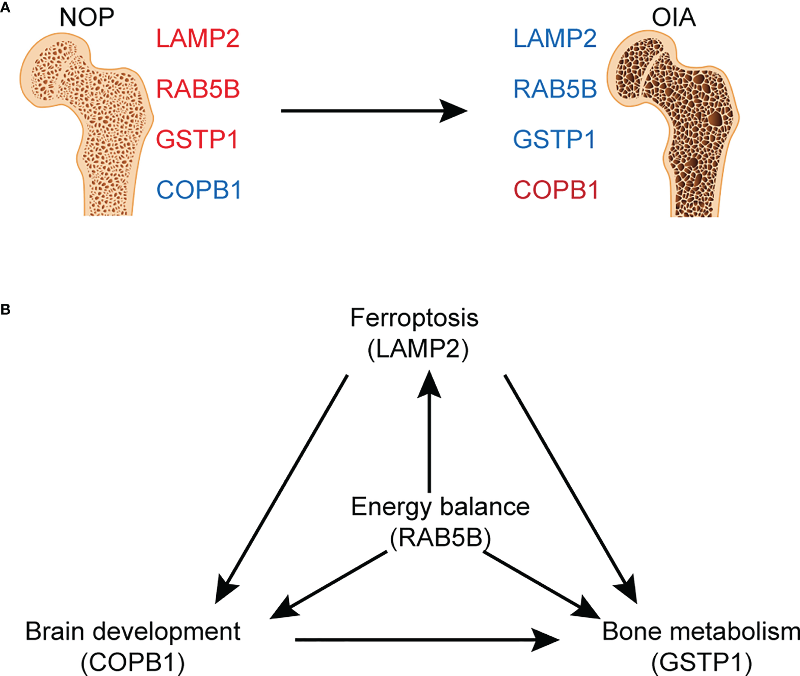 Graphed summary of four core proteins. (A) The changes of four core proteins between NOA and OIA. (B) The possible effects of four core proteins on the related pathogenesis.