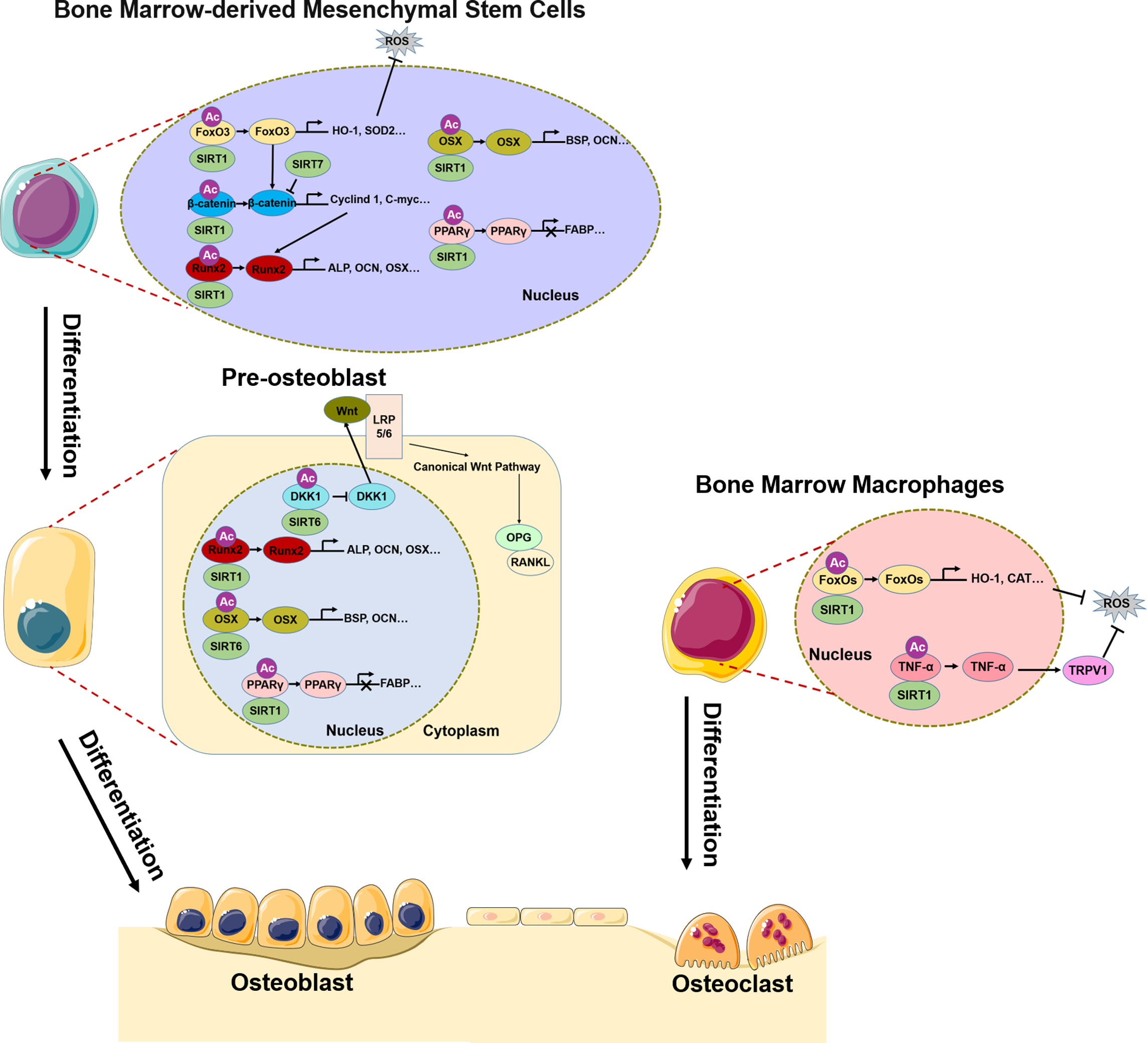 Role of SIRT1/6/7 in bone remodeling. In BMSCs, SIRT1, SIRT6, and SIRT7 promote osteogenic differentiation by regulating transcription factors FoxO3, β-catenin, Runx2, Osx, and PPARγ. In pre-osteoblasts, SIRT6 not only regulates Runx2 and Osx transcription, but also inhibits DKK1 transcription, activates canonical Wnt signaling, and promotes osteogenic differentiation. In BMMs, SIRT1 inhibits osteoclast differentiation by regulating FoxO and TNF-α transcription, which results in ROS scavenging.