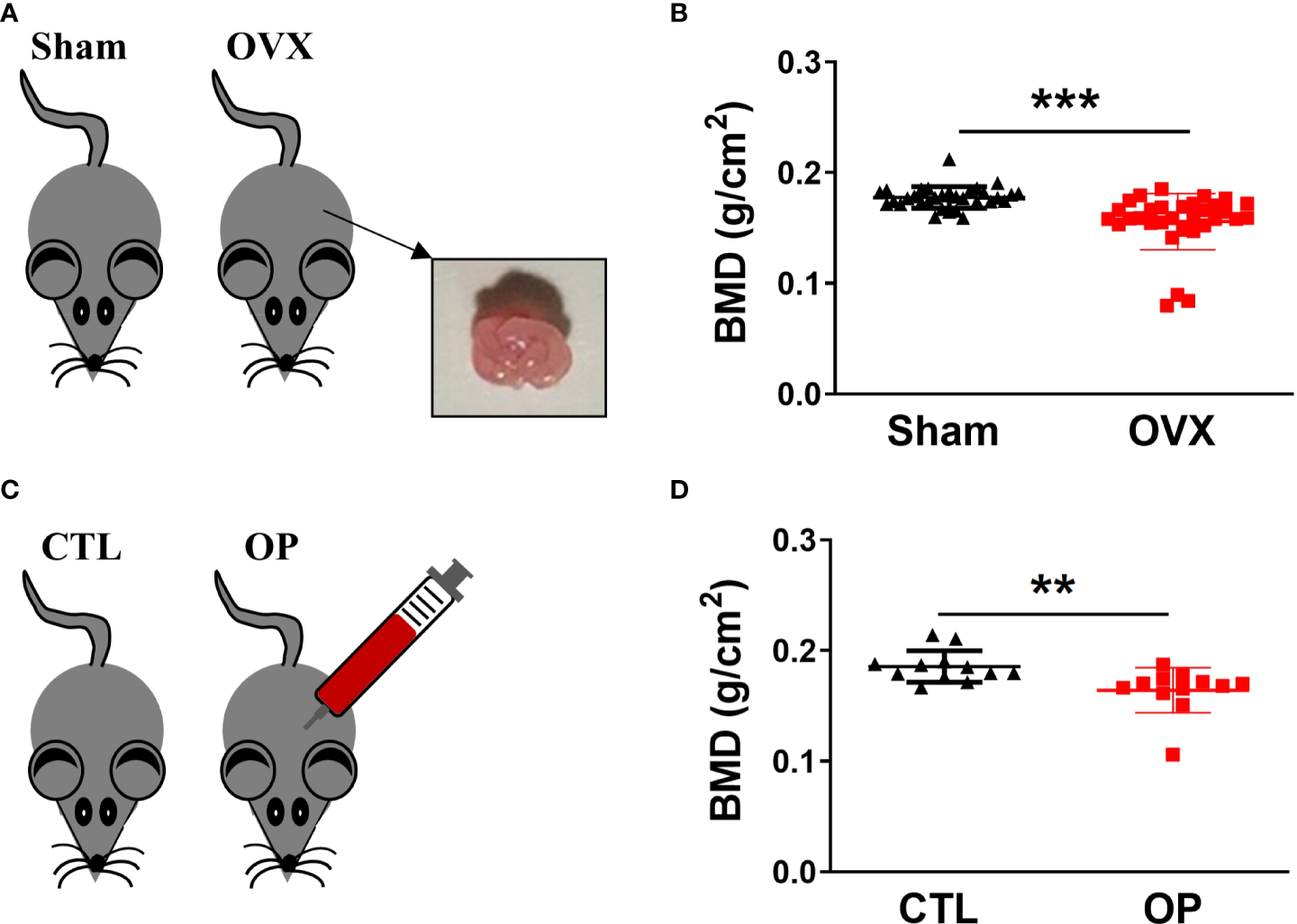 Construction of osteoporotic mice and identification of BMD. (A) Estrogen deficiency-related osteoporotic mouse models were constructed via bilateral ovariectomy (OVX) operation. (B) The whole body of BMD in estrogen deficiency-related osteoporotic mice was measured using dual energy-ray absorptiometry. n = 32. (C) Iron overload-induced osteoporotic mouse models were established via intraperitoneal injection of iron dextran. (D) Measurement of BMD in iron overload-induced osteoporotic mice. n=12. **p <0.01, ***p <0.001 versus sham or CTL. Sham, sham operation group; OVX, ovariectomy operation group; CTL, control group; OP, overload-induced osteoporotic group. BMD, bone mineral density.