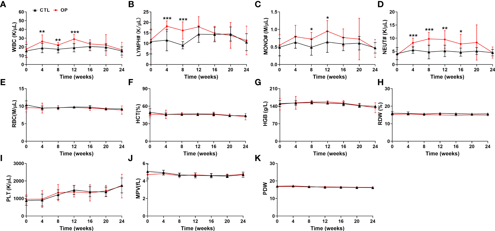 Detection of hematological indices in iron overload-induced osteoporotic mice. (A–K) The counts of WBC (A), LYMPH# (B), MONO# (C), NEUT# (D), RBC (E), HCT (F), HGB (G), RDW (H), PLT (I), MPV (J) and PDW (K) were examined in iron overload-induced osteoporotic mice. n=12. *p <0.05, **p <0.01, ***p <0.001 versus CTL. CTL, control group; OP, overload-induced osteoporotic group; WBC, white blood cells; LYMPH#, lymphocytes; MONO#, monocytes; NEUT#, neutrophils; RBC, red blood cells; HCT, hematocrit; HGB, hemoglobin; RDW, red cell distribution width; PLT, platelets; MPV, mean platelet volume; PDW, platelet distribution width.