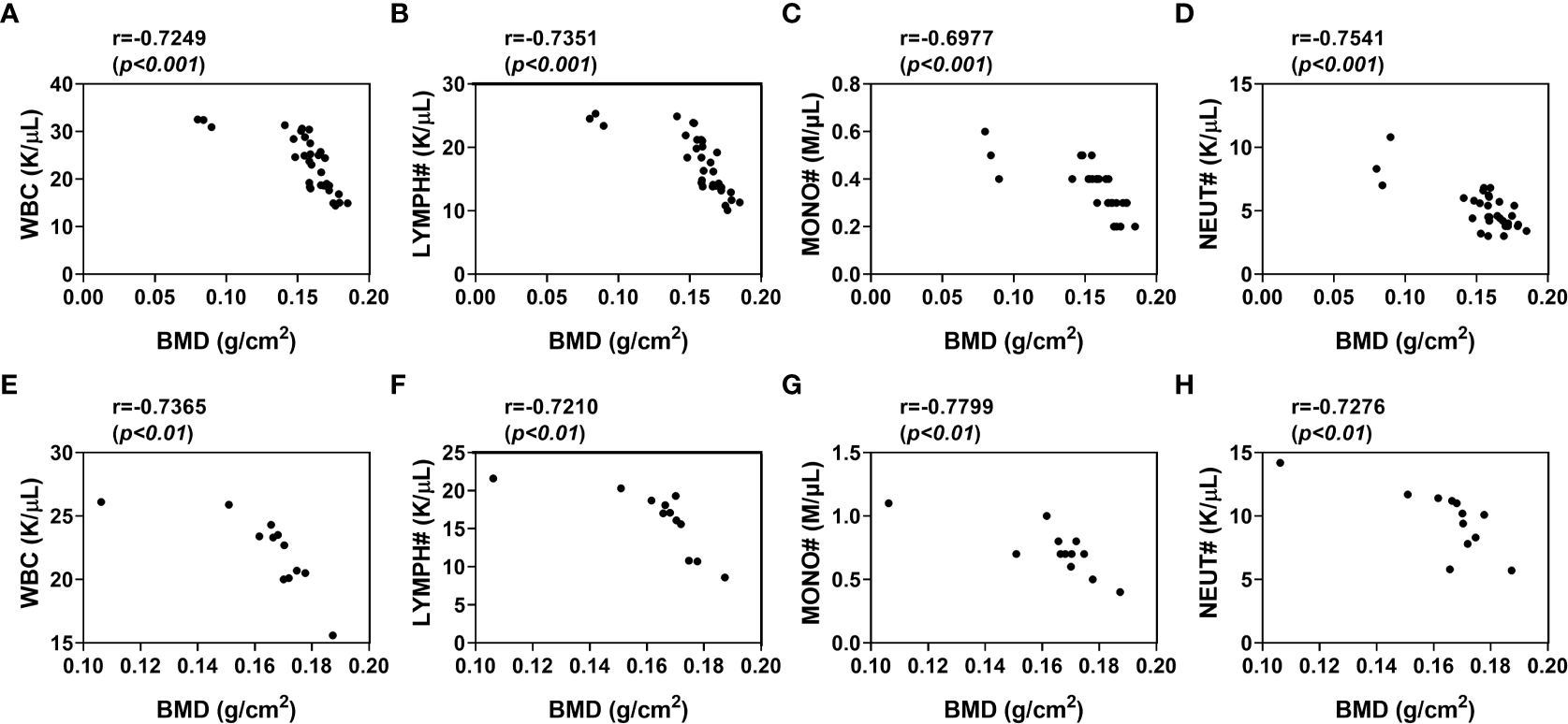 To further comform the correlation between blood cell counts and BMD in osteoporosis, we also analyzed this correlation in iron overload-induced osteoporotic mice. As expected, there were significant associations between peripheral blood cell counts and BMD in these osteoporotic mice (Figures 4E–H). The BMD of iron overload-induced osteoporotic mice was respectively and negatively associated with WBC (p <0.01, r=-0.7365), MONO# (p <0.01, r=-0.7210), LYMPH# (p <0.01, r=-0.7799) and NEUT# (p <0.01, r=-0.7276). These data indicated that peripheral blood WBC, monocytes, lymphocytes and neutrophils counts were independently and negatively associated with BMD in osteoporosis.