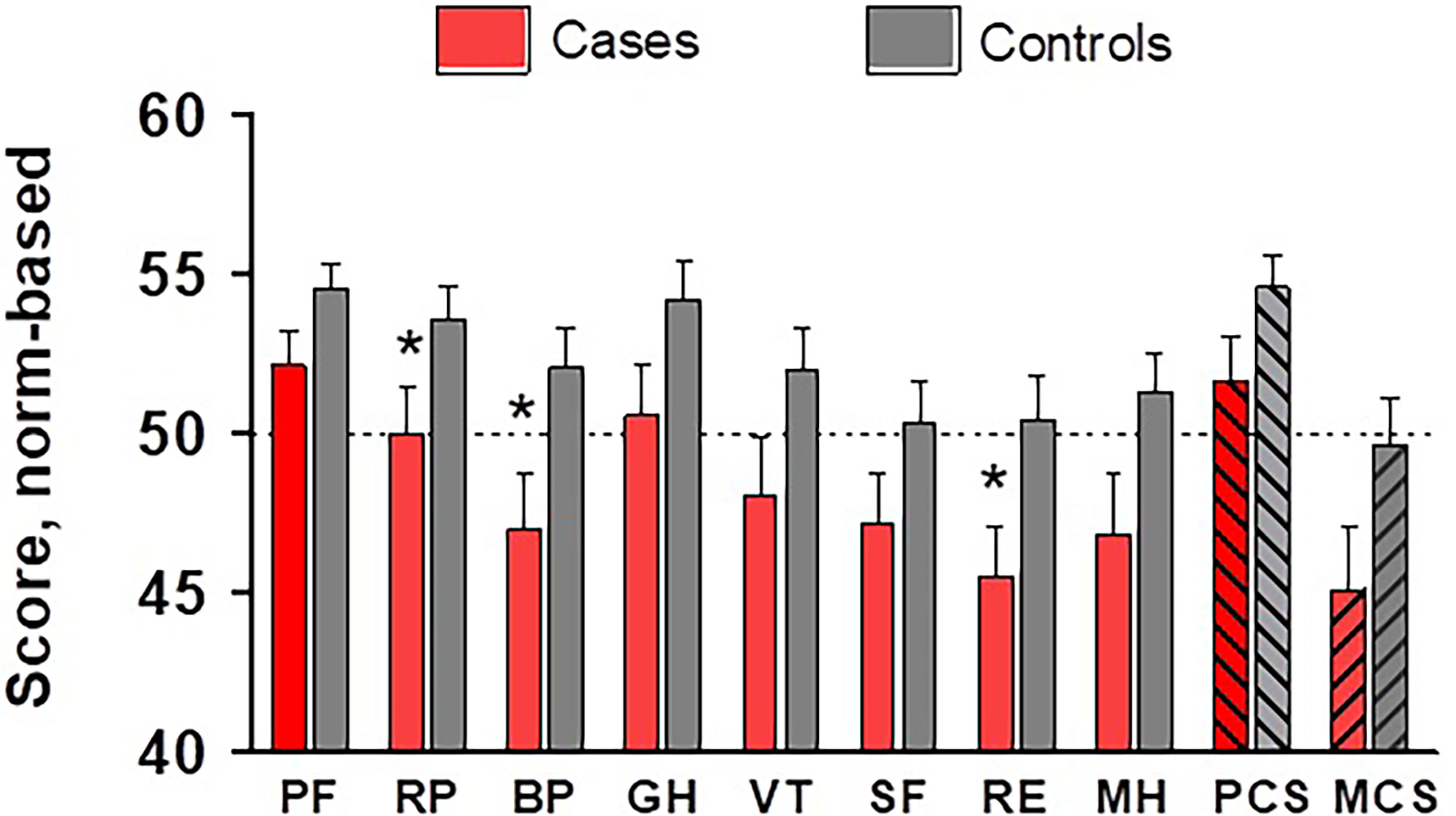 Scores across SF-36 dimensions and global components, normalized against the USA population, in cases (red bars) and controls (grey bars). * p<0.05. PF, physical functioning; RP, role physical; BP, body pain; GH, general health; VT, vitality; SF, social functioning; RE, role emotional; MH, mental health; PCS, physical component summary; MCS, mental component summary.