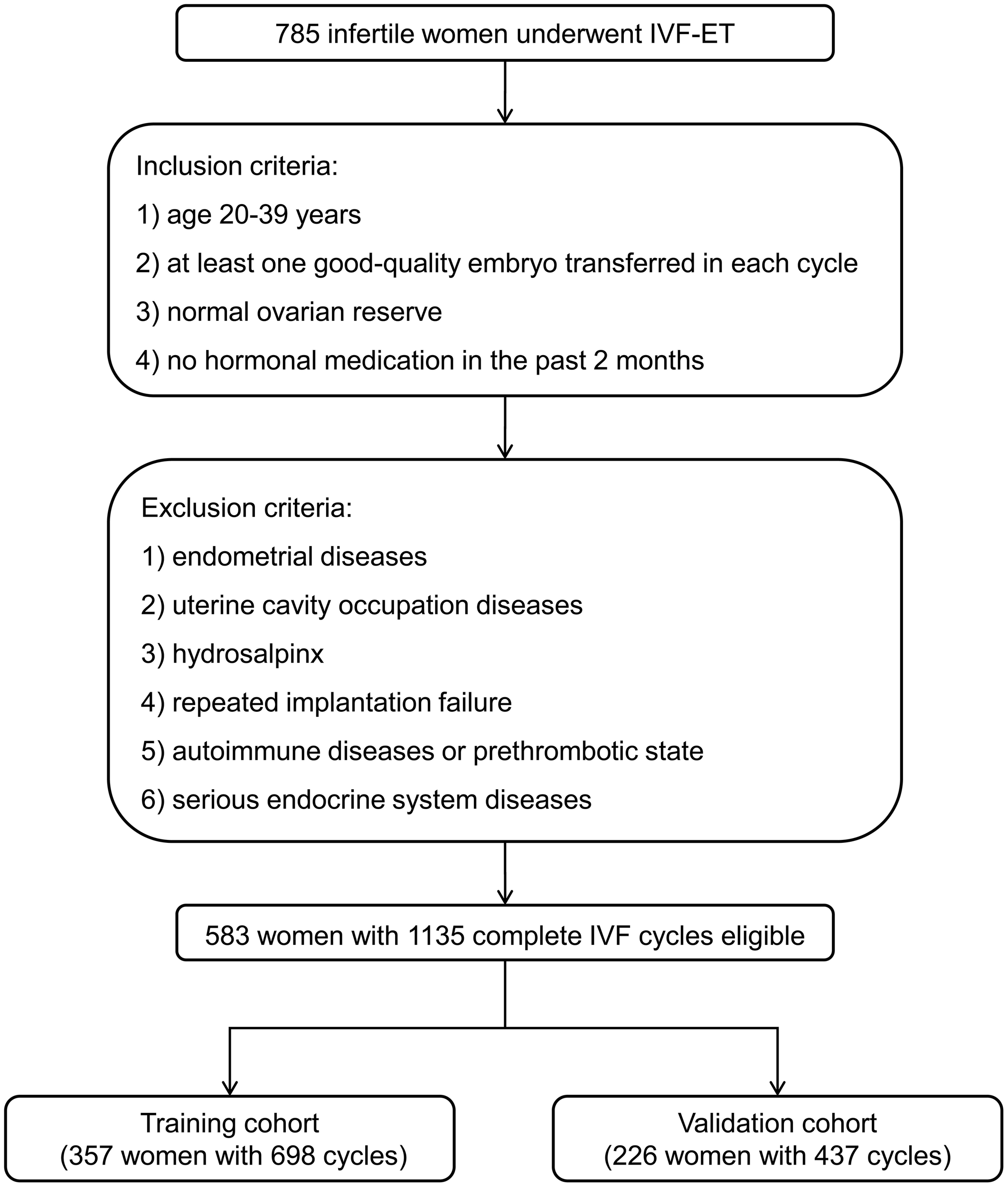Thus, 583 women with 1135 complete IVF cycles were eligible for the analysis. In order to independently validate the established nomogram, women with the IVF cycles from January 2019 to January 2021 were included in a training cohort (357 women with 698 cycles) and those from February 2021 to February 2022 were assigned to a validation cohort (226 women with 437 cycles) (Figure 1).