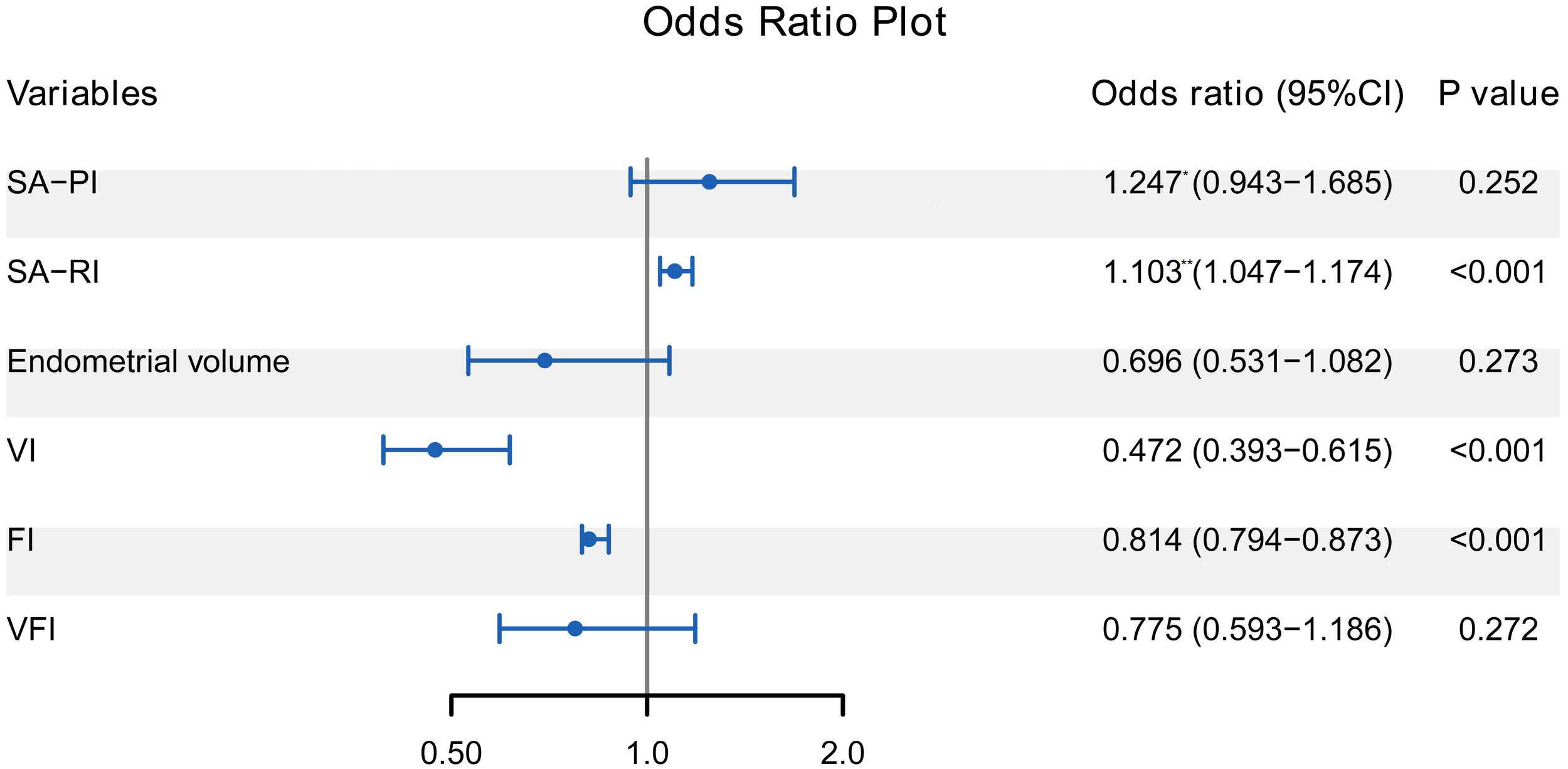 Forest plot of multivariate logistic regression analysis for the correlates of ET failure. SA-RI, VI, and FI were independently associated with ET failure (all P < 0.05). The odds ratio represented by * is the increased risk per 0.1 unit increase, and the ** represents the increased risk per 0.01 unit increase. ET, embryo transfer; SA, spiral artery; PI, pulsatility index; RI, resistance index; VI, vascularisation index; FI, flow index; VFI, vascularisation flow index.