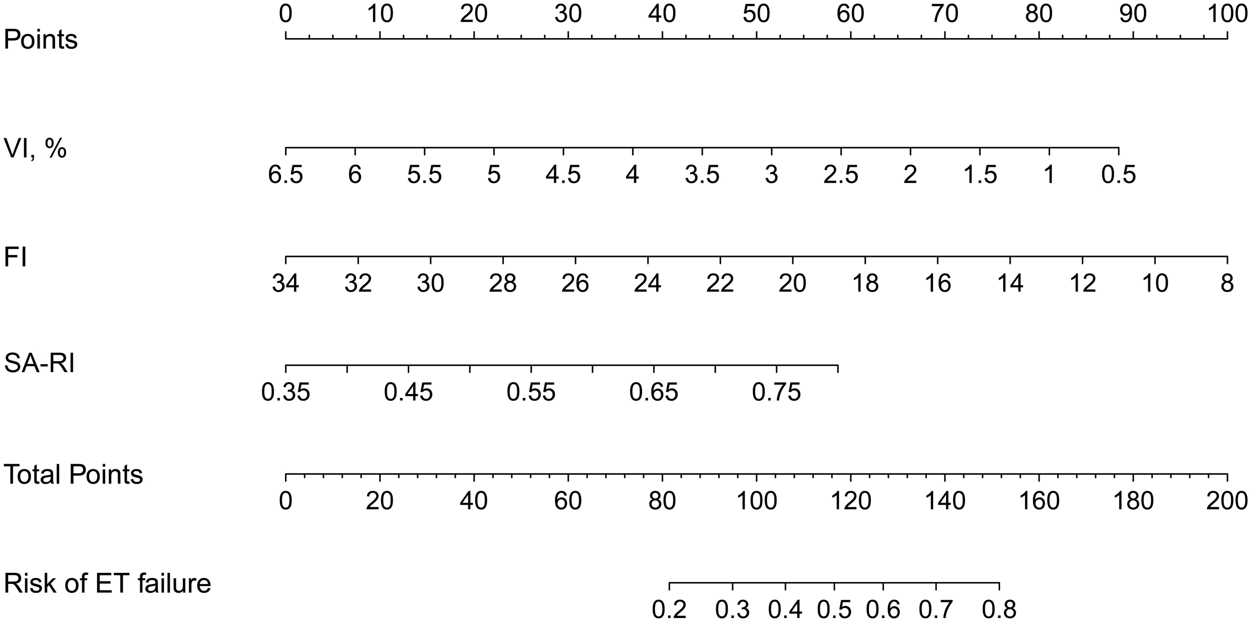 The 6 variables further entered the multivariate logistic regression analysis to investigate the independent correlates of ET failure. Figure 2 revealed that SA-RI, VI, and FI were independently associated with ET failure (all P < 0.05). Increasing SA-RI was more likely to lead to ET failure, with an OR of 1.103. Increased VI and FI helped minimize the risk of ET failure with ORs of 0.472 and 0.814, respectively.