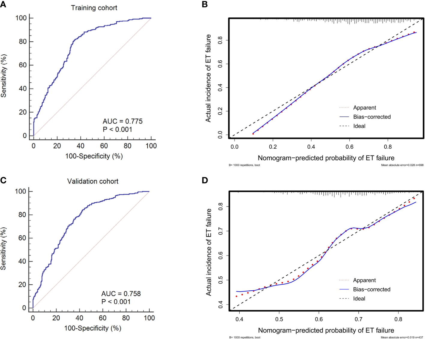ROC curves and calibration plots of the training and validation cohorts to evaluate the discrimination and calibration of the nomogram. The AUCs of ROC curves are 0.775 (A) and 0.758 (C) in the training and validation cohorts, both indicating good discrimination. The calibration curves indicate that the predicted probability of ET failure match the actual incidence well both in the training (B) and validation cohorts (D). ET, embryo transfer; ROC, receiver operating characteristic; AUC, area under the curve.