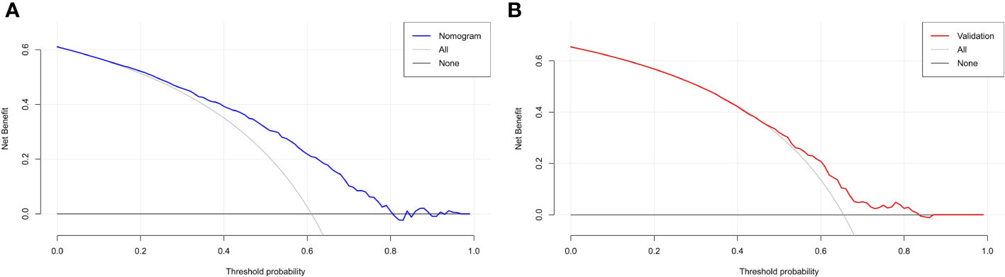DCA based on the training and validation cohorts for evaluating the clinical utility of the nomogram. (A) reveals that in the training cohort, the nomogram yields clinical net benefits when the threshold probability is between 20% and 80%. (B) suggests that in the validation cohort, clinical net benefits are obtained when the threshold probability is between 45% and 80%. Both indicate good potential for clinical utility. DCA, decision curve analysis.