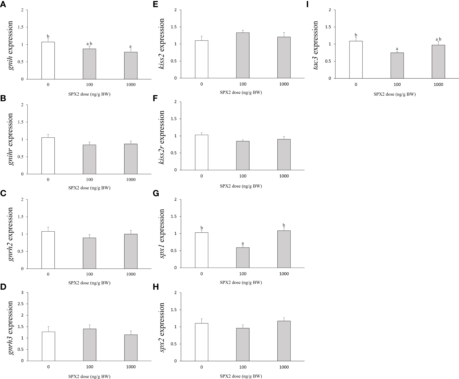 Finally, we detected the effects of SPX2 on the expression levels of tac3 expressed in the brain (Figure 1I). Only SPX2 at the dose of 100 ng/g BW exerted an inhibitory action on tac3 expression levels (Figure 1I).