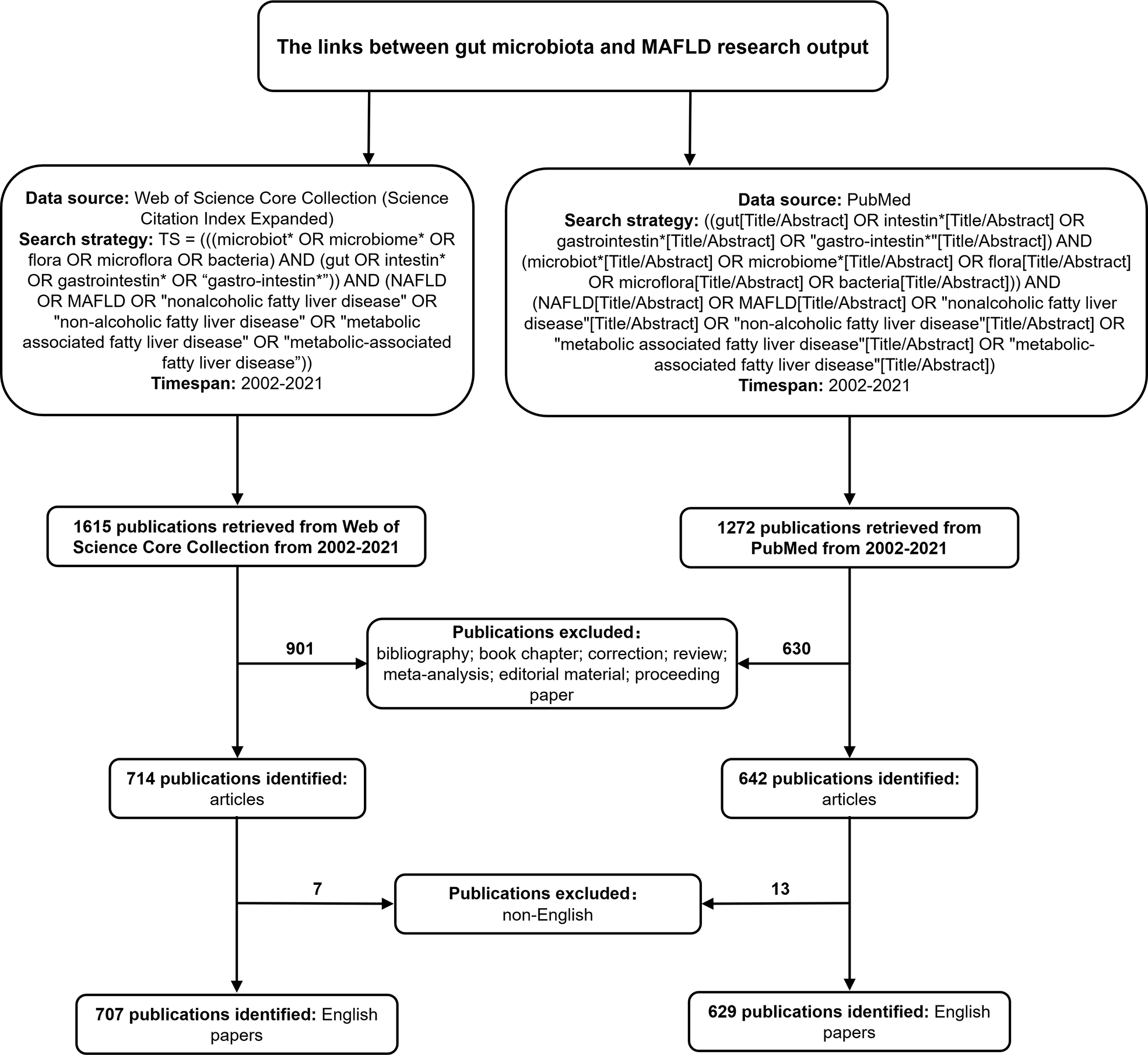 We retrieved relevant publications in WoSCC through the following search strategy: TS = (((microbiot* OR microbiome* OR flora OR microflora OR bacteria) AND (gut OR intestin* OR gastrointestin* OR “gastro-intestin*”)) AND (NAFLD OR MAFLD OR “nonalcoholic fatty liver disease” OR “non-alcoholic fatty liver disease” OR “metabolic associated fatty liver disease” OR “metabolic-associated fatty liver disease”)) AND Language=English and Document type=Article. Only the SCI-E database was selected. The search strategy for PubMed was ((gut[Title/Abstract] OR intestin*[Title/Abstract] OR gastrointestin*[Title/Abstract] OR “gastro-intestin*”[Title/Abstract]) AND (microbiot*[Title/Abstract] OR microbiome*[Title/Abstract] OR flora[Title/Abstract] OR microflora[Title/Abstract] OR bacteria[Title/Abstract])) AND (NAFLD[Title/Abstract] OR MAFLD[Title/Abstract] OR “nonalcoholic fatty liver disease”[Title/Abstract] OR “non-alcoholic fatty liver disease”[Title/Abstract] OR “metabolic associated fatty liver disease”[Title/Abstract] OR “metabolic-associated fatty liver disease”[Title/Abstract]). The exclusion criteria were as follows: (i) no statements relating to the composition of the microbiota, (ii) no statement relating to MAFLD, (iii) only articles were included, bibliography, book chapter, correction, review, meta-analysis, editorial material, and proceeding paper were excluded and (iv) duplicate publication were excluded. To confirm the accuracy of bibliometric analysis results, the reviewer Yixuan Li identified all publications retrieved by the search strategy above, including titles, abstracts, and publication years. In total, the articles on the links between gut microbiota and MAFLD were ultimately analyzed in our study. The detailed screening is shown in Figure 1.