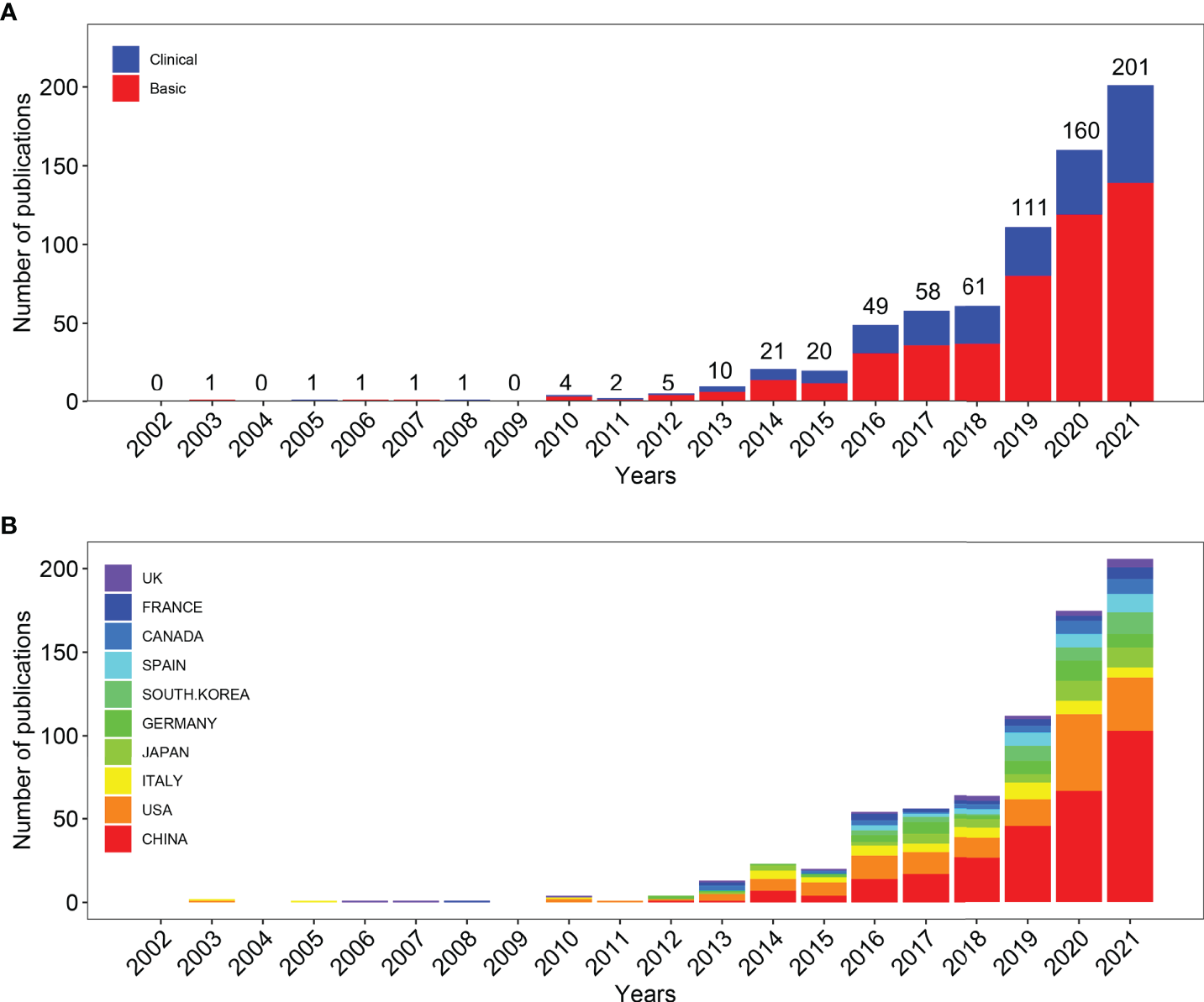 We conducted a comprehensive literature search within the Science Citation Index-Expanded (SCI-E) of Web of Science Core Collection (WoSCC) database for the period 2002-2021 on March 28, 2022. Also, a literature search by PubMed database was conducted on September 25, 2022 for a supplement. In order to reduce the bias incurred by frequent database updates, we completed the search and retrieved data in 1 day.