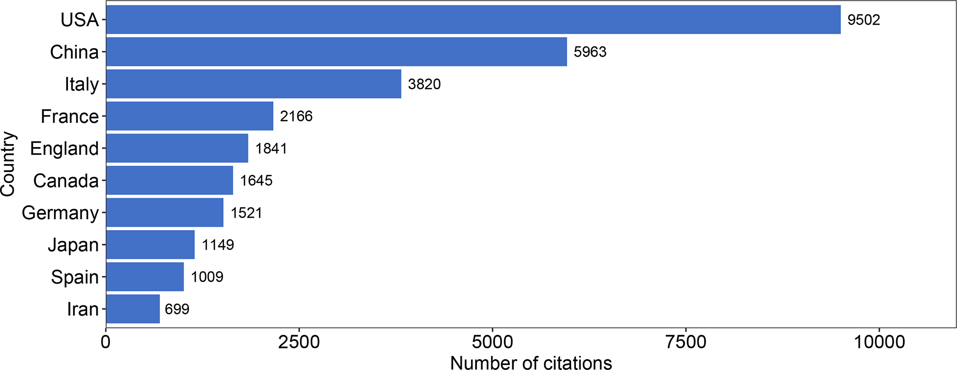 Bar graph of the total number of citations from 707 retrieved articles among countries in 2002-2021. The top 10 countries with the highest total number of citations are shown. Each bar represents a country, and the length is positively correlated with the total number of citations.
