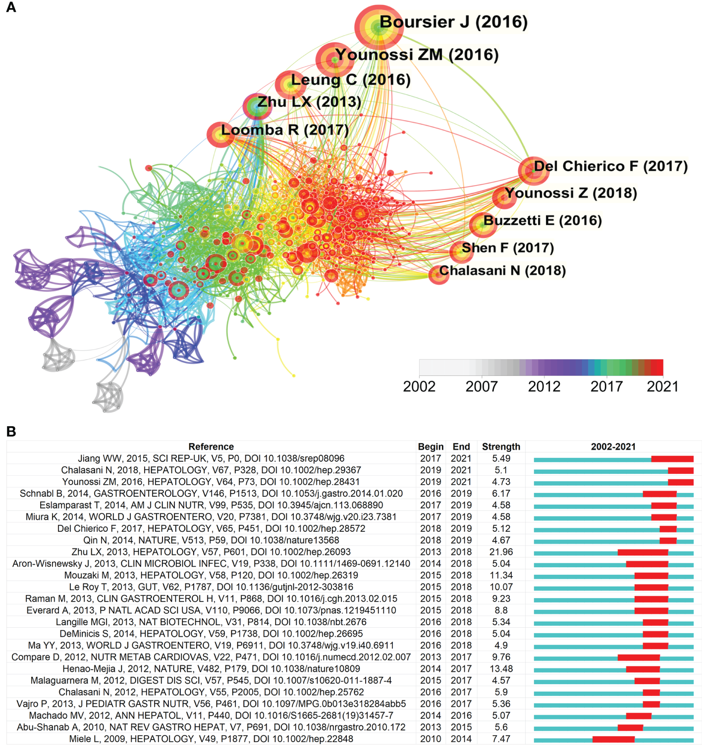 Reference co-citation network analysis of publications on the links between the gut microbiota and MAFLD between 2002 and 2021. (A) CiteSpace co-citation map of 20616 references on the links of gut microbiota and MAFLD research, filter option showing the largest connected component only. Each node represents a reference and the links between nodes mean these articles were cited as references in the same article within the retrieved 707 articles. The size of the node is positively related to the frequency of citation and line thickness means the correlation with the co-cited papers. The color represents the year of publication as shown in the color bar. (B) Reference with the strongest burst strength of the 707 citing articles on the links of gut microbiota and MAFLD research between 2002 and 2021. Reference marked in red indicates a sudden increase in usage frequency of this reference during that period. Blue represents a relatively unpopular time period.