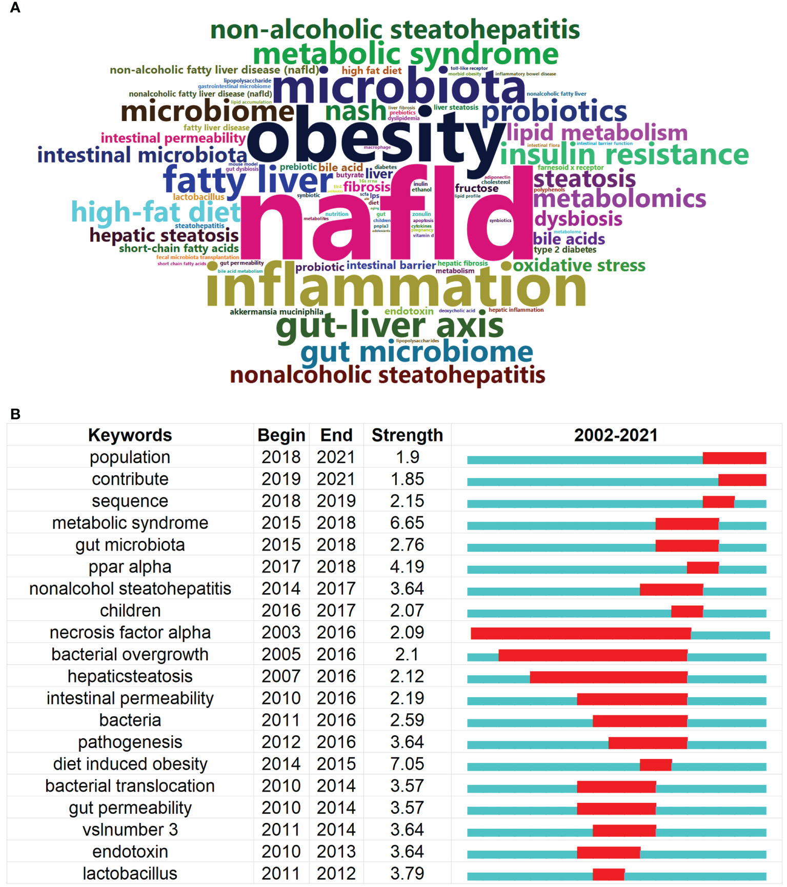 In all, the 707 articles were published by 53 countries and regions between 2002 and 2021. The Vosviewer software was applied to investigate the cooperation relation between them. As is shown in Figure 3A, the diagram represents the scholarly cooperation in the connection of the gut microbiota and MAFLD between countries/regions, where each circle symbolizes a country/region, and the links indicate the strength of international cooperation with each other. The size of the circle represents the number of articles published by each country/region and the thickness of the connecting lines indicates the degree of cooperation between them. The result provided evidence that the USA was the country that was the most frequently involved in international cooperation. Besides, the USA and China had the most frequent cooperation among countries/regions, and the cooperation of the USA and Italy came second.