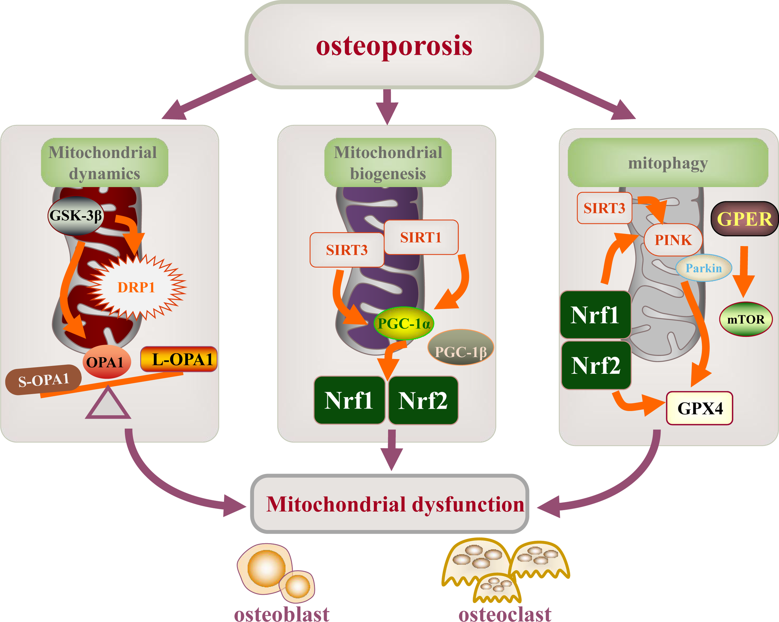 Mitochondrial dysfunction is involved in the mechanism of osteoporosis. Mitochondrial dysfunction (mitochondrial dynamics, mitochondrial biogenesis, and mitophagy) leading to the development and progression of osteoporosis. The main targets of mitochondrial dysfunction are DRP1, OPA1, GSK-3β, mTOR, SIRT1/3, PGC-1α, NRF2/2, PINK1, and Parkin.