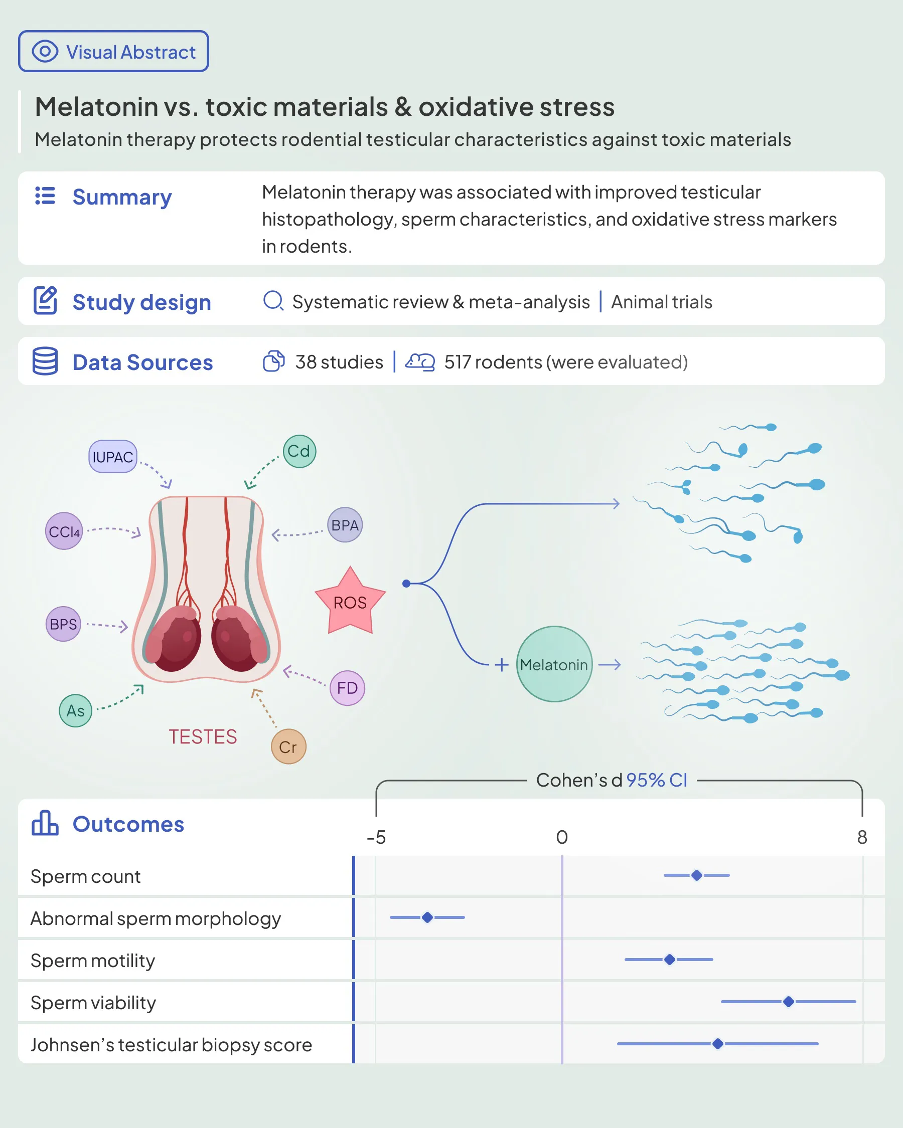 Out of 10039 records, 38 studies were eligible for the review, of which 31 were included in the meta-analysis. Most of them showed beneficial effects of melatonin therapy on testicular tissue histopathology. [20 toxic materials were evaluated in this review, including arsenic, lead, hexavalent chromium, cadmium, potassium dichromate, sodium fluoride, cigarette smoke, formaldehyde, carbon tetrachloride (CCl4), 2-Bromopropane, bisphenol A, thioacetamide, bisphenol S, ochratoxin A, nicotine, diazinon, Bis(2-ethylhexyl) phthalate (DEHP), Chlorpyrifos (CPF), nonylphenol, and acetamiprid.] The pooled results showed that melatonin therapy increased sperm count, motility, viability and body and testicular weights, germinal epithelial height, Johnsen's biopsy score, epididymis weight, seminiferous tubular diameter, serum testosterone, and luteinizing hormone levels, testicular tissue Malondialdehyde, glutathione peroxidase, superoxide dismutase, and glutathione levels. On the other hand, abnormal sperm morphology, apoptotic index, and testicular tissue nitric oxide were lower in the melatonin therapy arms. The included studies presented a high risk of bias in most SYRCLE domains.