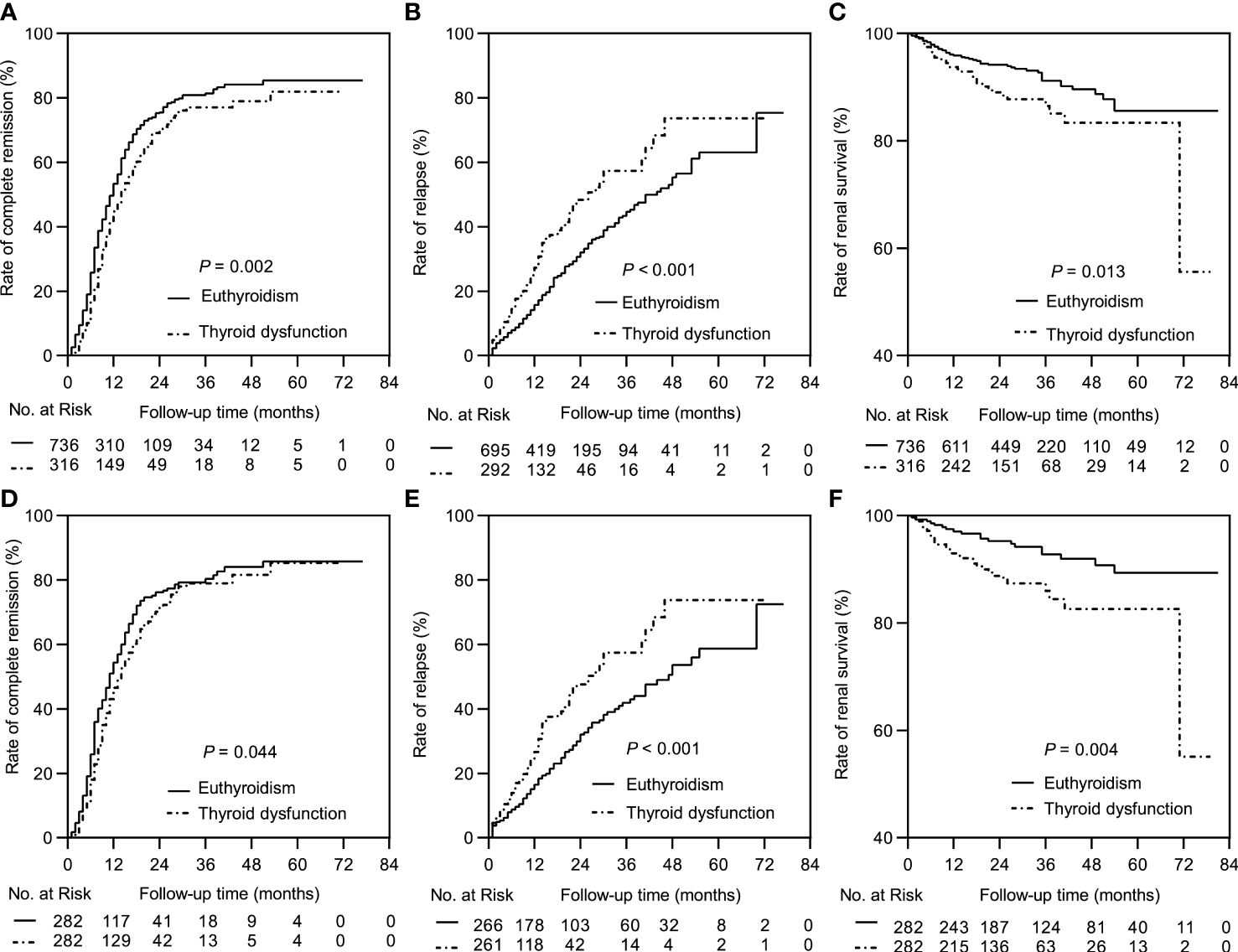 Figure 2 Kaplan-Meier curves between the euthyroid group and thyroid dysfunction group. In the complete dataset: (A) Complete remission rate; (B) Relapse rate; (C) Renal survival rate. In the propensity matched dataset: (D) Complete remission rate; (E) Relapse rate; (F) Renal survival rate.