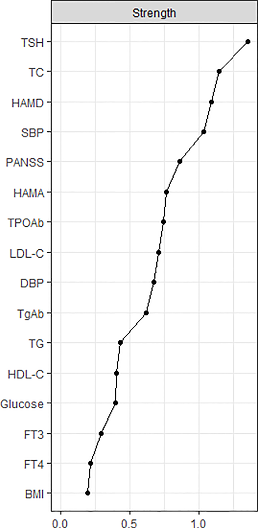 Figure 1 illustrates the network of thyroid dysfunction, metabolic disorders, and clinical symptoms in patients with FEND MDD. The network consists of 16 nodes with a density of 0.44 (53/120). Visually, the node TSH is located in the center of the network. It shows a strong relationship with metabolic disorders (i.e. SBP, Glucose, and TC). It was also positively correlated with HAMA, HAMD, and PANSS. We also observed a strong relationship between HAMA, HAMD, and PANSS. The ten strongest edges in the network were SBP-DBP, followed by TPOAb-TgAb, TC-LDL-C, HAMD-PANSS, HAMA-PANSS, TSH-Glucose, HAMD-HAMA, HAMD-TC, TSH-TC, and TSH-TC. According to the results of the nonparametric bootstrap procedure, these edges were statistically stronger than the other edges within the network (Figure S1). The value of the edges is listed in Table S2.