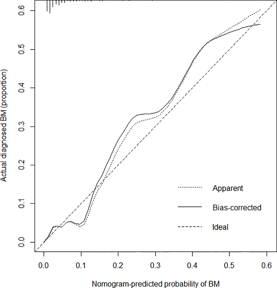Calibration curves for the bone metastasis prediction nomogram. The x-axis represents the predicted bone metastasis risk. The y-axis represents actual diagnoses of bone metastases. The diagonal dotted line represents a perfect prediction by an ideal model. The solid line represents the performance of the nomogram, where a closer fit to the diagonal dotted line represents a better prediction.