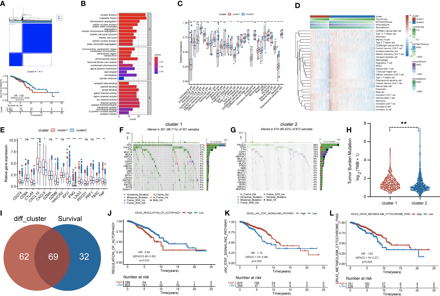 (A) Consensus clustering matrix for k = 2 and Kaplan–Meier curve revealed OS of patients in cluster 1 (red) and cluster 2 (blue). (B) Gene Ontology (GO) based on differentially expressed genes (DEGs) between two clusters. (C) The infiltrating levels of 28 immune cell types were compared between cluster 1 (red) and cluster 2 (blue). ns, no significance,*p < 0.05, **p < 0.01 and ***p < 0.001. (D) Heatmap for the landscape of immune cell types (rows) in patients (columns). Column annotations represent cluster, Tumor Purity, ESTIMATE Score, Immune Score, and Stromal Score. (E) The box plot compared the expression of different immune targets between cluster 1 (red) and cluster 2 (blue). ns,no significance,*p < 0.05, **p < 0.01 and ***p < 0.001. Waterfall maps revealed genetic alterations of BC patients in cluster 1 (F) and cluster 2 (G). (H) Relative distribution of tumor mutational burden (TMB) in cluster 1 versus cluster 2 exhibited in the boxplot. (I) Venn diagram indicating 69 survival-related pathways. (J–L) Kaplan–Meier curves for three pathways highly associated with survival, including regulation of autophagy, JAK/STAT signaling pathway, and drug metabolism cytochrome p450. OS, overall survival; BC, breast cancer.