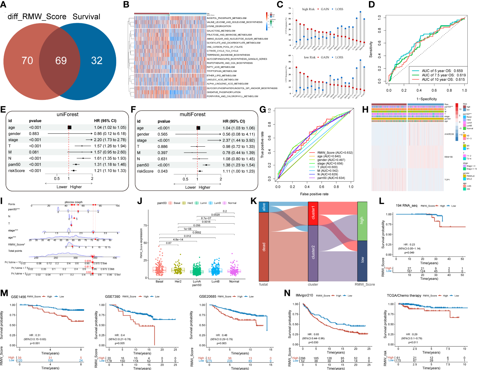 (A) Venn diagram for 69 distinct pathways related to survival in two subgroups. (B) The survival-related pathways (rows) for each patient (columns) are shown in the heatmap. Red represents high expression, and blue represents low expression. (C) The CNV gain and loss frequency in RMW_Score-high and RMW_Score-low groups. (D) ROC curve analyses were performed to evaluate the predictive value of RMW_Score in patients (AUC of 0.659, 0.619, and 0.615 for 5-, 7.5-, and 10-year overall survival, respectively). (E, F) Forest plots for the independence of RMW_Score as a prognostic predictor by univariate and multivariate Cox regression. (G) ROC curves for RMW_Score, age, gender, stage, T, M, N, and PAM50. (H) Heatmap depicting the relationships between three patterns (one RNA modification “writer” and two related genes) and RMW_Score and clinical characteristics. (I) RMW_Score, age, stage, T, N and PAM50 were used to construct a nomogram (*, p< 0.05; ***, p< 0.001). (J) Comparison of RMW_Score expression in different PAM50 subgroups. (K) Alluvial diagram of survival status in groups with different clusters and RMW_Score. (L) The Kaplan–Meier curves for 194 patients from our follow-up data. (M) Kaplan–Meier curves suggested that the RMW_Score-low group all had better OS in the GSE1456 cohort (n = 159, p< 0.001), GSE7390 cohort (n = 198, p = 0.005), and GSE20685 cohort (n = 327, p = 0.003). (N) The Kaplan–Meier curves of OS for predicting the immunotherapeutic and chemotherapeutic benefits respectively in the IMvigor210 cohort and TCGA cohort. CNV, copy number variation; ROC, receiver operating characteristic; AUC, area under the curve; OS, overall survival.