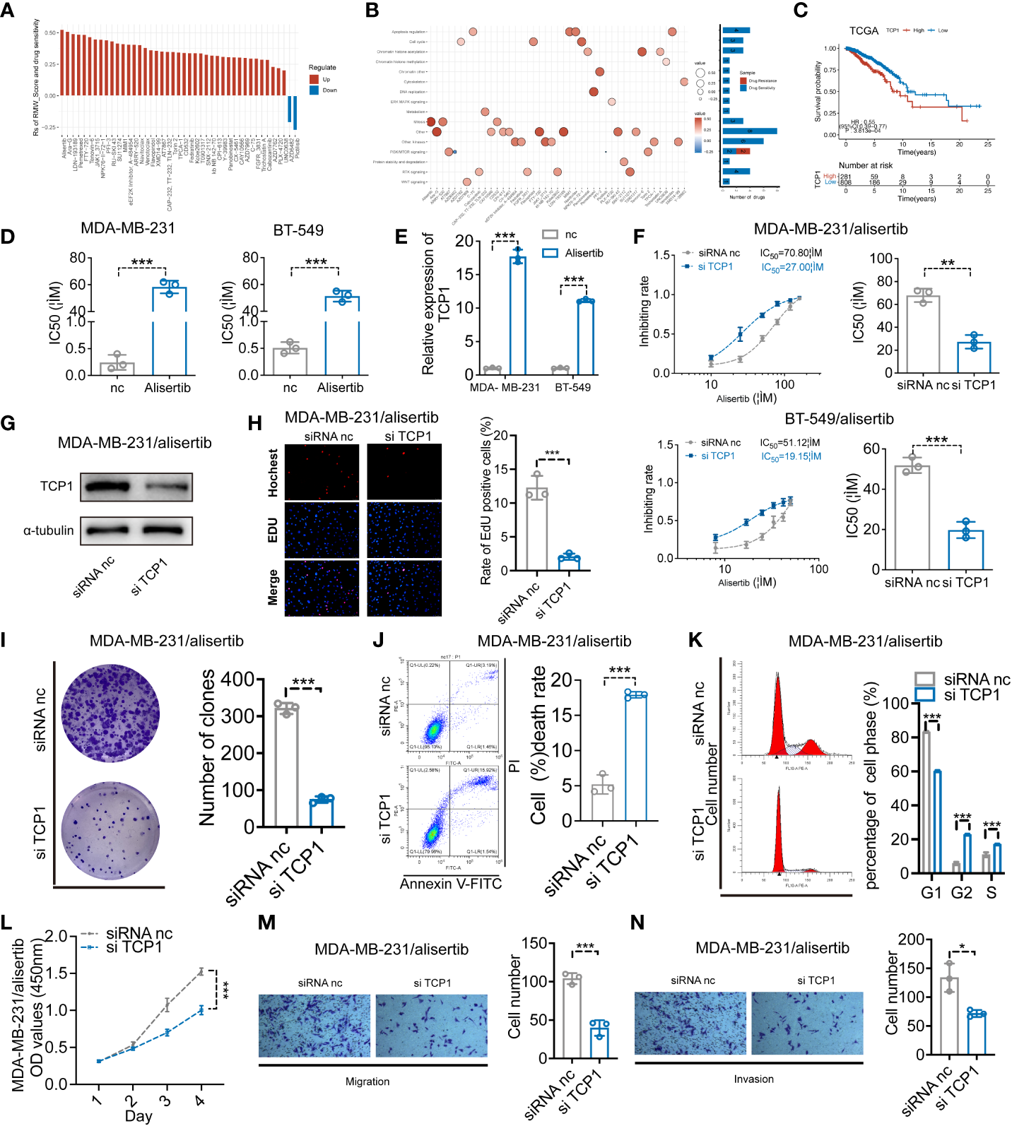 (A) Spearman’s analysis estimating the correlation between RMW_Score and drug sensitivity. Each column indicates a drug. Rs > 0, drug resistance; Rs< 0, drug sensitive. (B) Drug-targeted signaling pathways based on the RMW_Score. Red represents resistance; blue represents sensitivity. The significance of the correlation was indicated by the size of the point. (C) The Kaplan–Meier curves for subgroups with different TCP1 expressions. (D) The cell viability assay was used to compare drug resistance between BC cells and their respective drug-resistant cells. (E) The expression levels of TCP1 were detected by qRT-PCR. (F) The effects of expression of TCP1 on the inhibiting rate were calculated by CCK-8 assay after 48-h treatment of alisertib, and the IC50 was calculated by SPSS. (G) The efficiency of TCP1 knockdown was confirmed by Western blotting analysis. (H) EdU assays indicated the effects of TCP1 knockdown on cell proliferation in MDA-MB-231/alisertib cells. Scale bars = 100 μm. (I) Colony formation assay of siRNA-treated MDA-MB-231/alisertib cells. (J) Apoptosis analysis of the effects of TCP1 knockdown and statistical analysis are shown. (K) Cell cycle analysis of the effects of TCP1 knockdown and the cell cycle distribution is shown. (L) CCK-8 assays showed the effects of TCP1 knockdown on MDA-MB-231/alisertib cell proliferation. (M, N) Effects of TCP1 knockdown on cell migration and invasion in MDA-MB-231/alisertib cells by transwell assay. Scale bars = 100 μm. Data were analyzed with the mean ± SD of three replicates. *p< 0.05, **p< 0.01, and ***p< 0.001. BC, breast cancer; CCK-8, Cell Counting Kit-8.