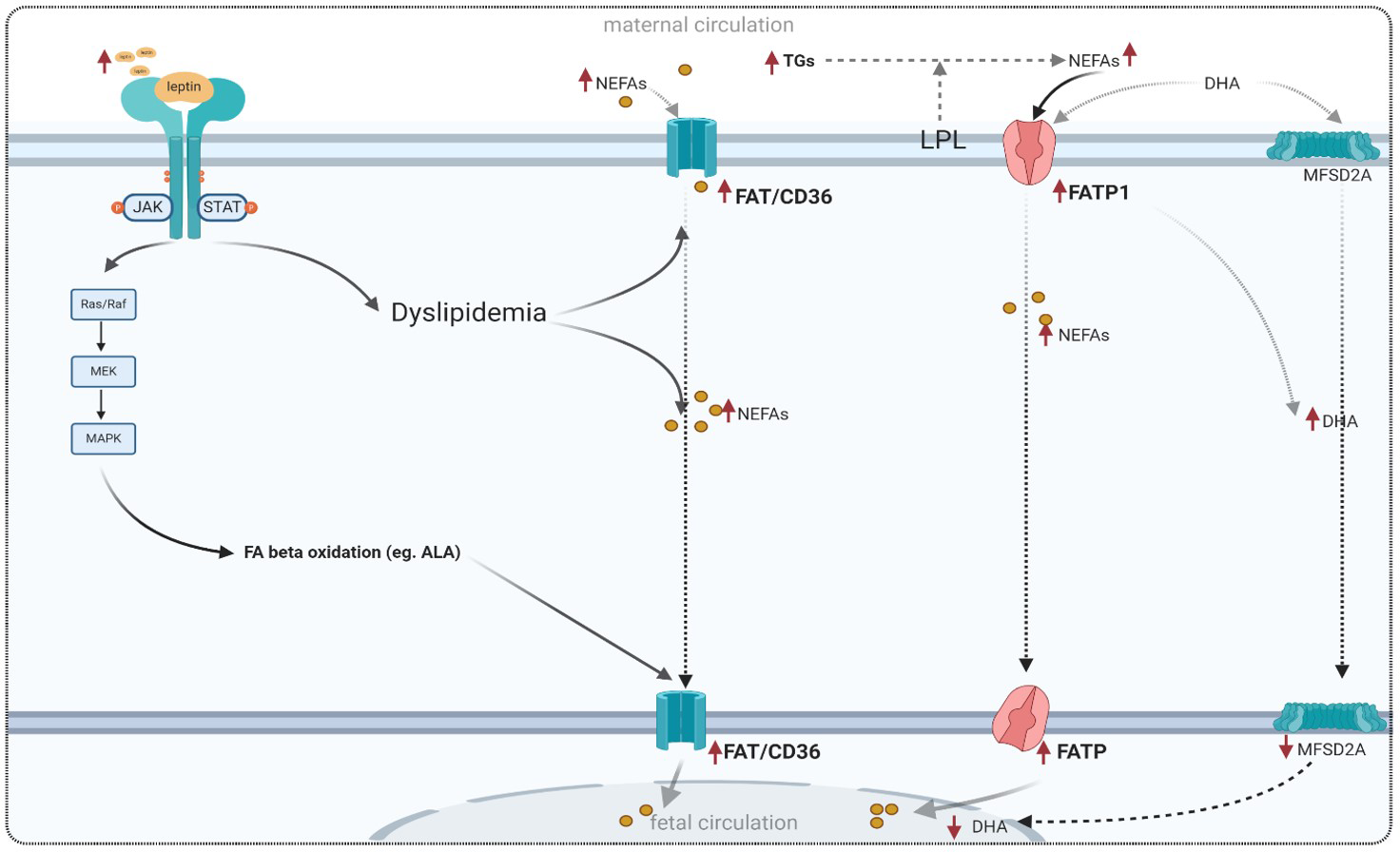 Maternal-fetal macronutrient transport is primarily mediated by a family of placental transporters. For example, glucose transport, in particular, is mediated by glucose transporters (GLUTs) (15), while amino acid transport is mediated by several membrane transport proteins, including the sodium-dependent system A transporter, also called the serotonin N-acetyltransferase (SNAT) family and the sodium-independent system L transporter, known as the large neutral amino acid transporters (LATs) family (16, 17). On the other hand, lipid transport is mediated by the free fatty acid transporter (FATB), fatty acid-binding proteins (FABPs), and the activity of lipases in the MVM of syncytiotrophoblast (18).