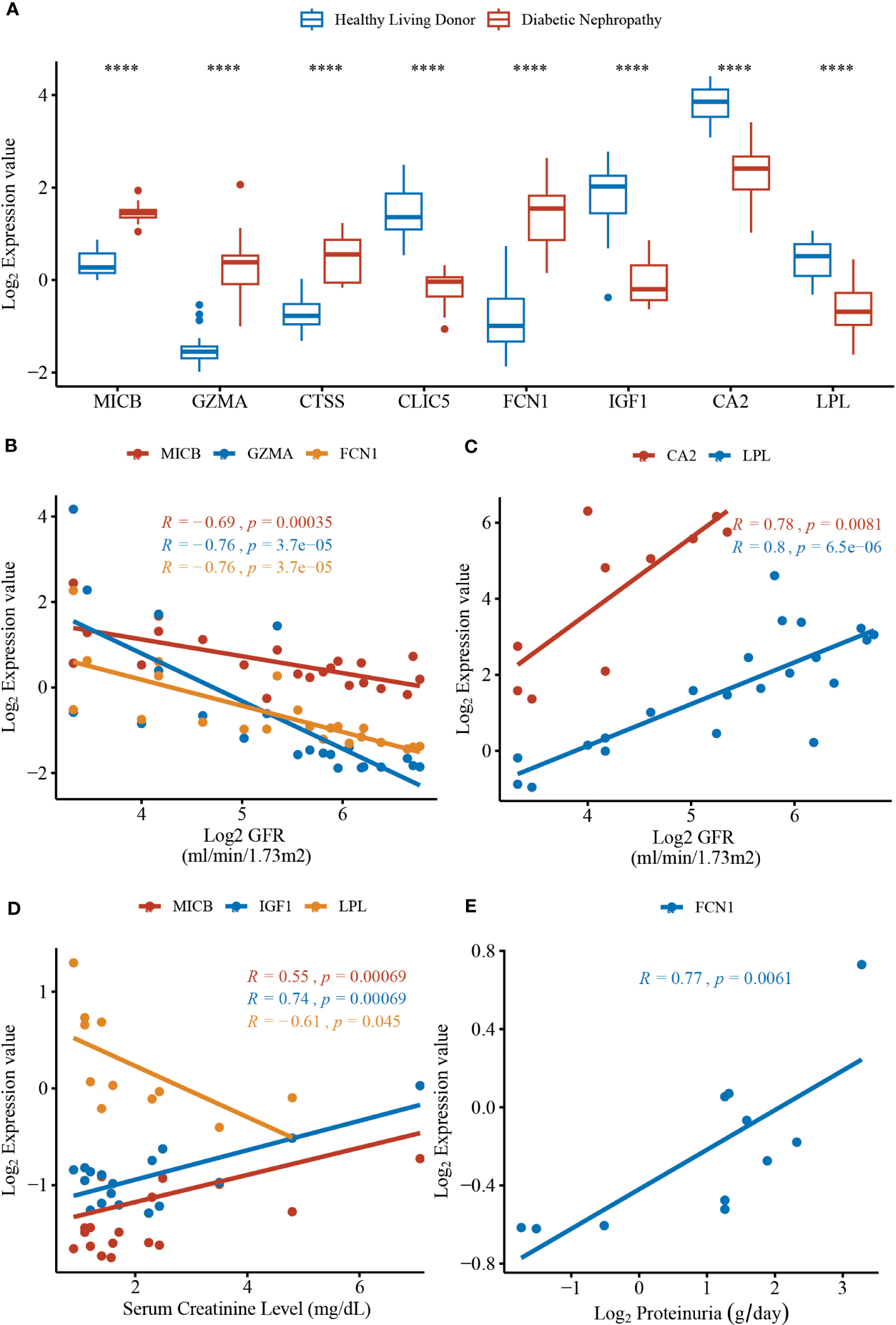 The mRNA expression levels of hub genes and clinical correlation from data in Nephroseq v5 online tool. (A) The expression level of MICB (P = 3.10 × 10-12), GZMA (P = 3.10 × 10-6), CTSS (P = 6.60 × 10-7), CLIC5 (P = 9.50 × 10-16), FCN1 (P = 9.30 × 10-9), IGF1 (P = 3.50 × 10-9), CA2 (P = 5.10 × 10-6), LPL (P = 6.10 × 10-7). (B) The expression of MICB, GZMA, and FCN1 negatively correlated with GFR. (C) The expression of CA2 and LPL positively correlated with GFR. (D) The expression of MICB, IGF1 and LPL correlated with serum creatinine level. (E) The expression of LPL positively correlated with proteinuria. The DN groups represent the diabetic nephropathy patients and the Normal groups represent the healthy controls. GFR, glomerular filtration rate. ****P < 0.0001.