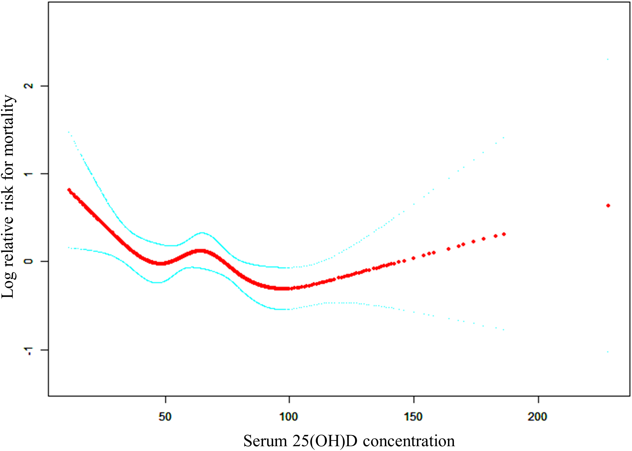 Figure 2 The non-linear relationship between serum 25(OH)D concentrations and the risk of all-cause mortality.
