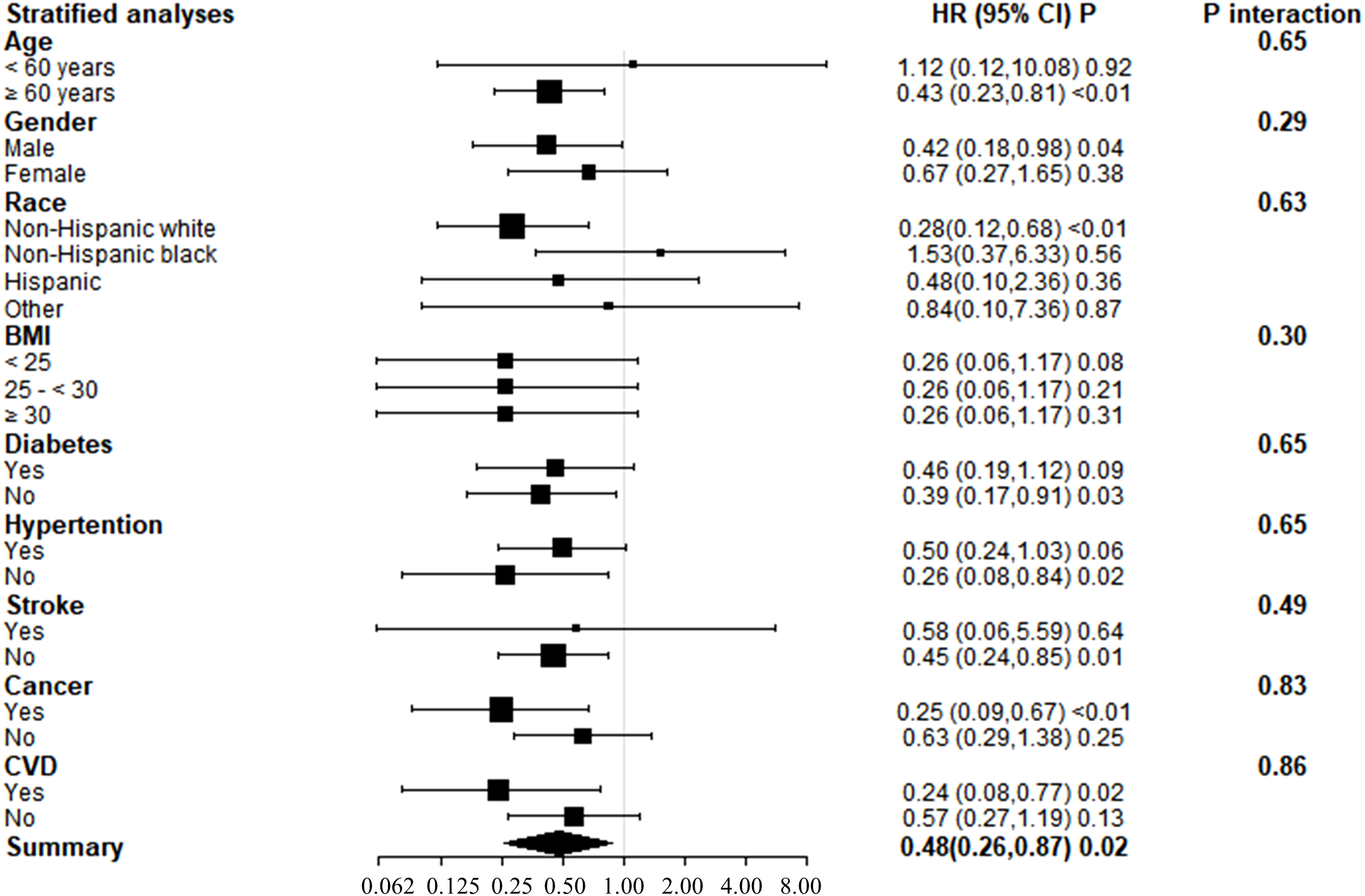 Subgroup analyses of adjusted model 3 were conducted to determine the benefit of increased serum 25(OH)D concentrations on KSD patient survival, stratified by age, gender, race, BMI, diabetes, hypertension, stroke, cancer, and CVD (Figure 3). Serum 25(OH)D concentrations and stratification factors did not show significant interaction. Although the interaction was not clear, our findings revealed stronger inverse associations between 25(OH)D concentrations and all-cause mortality in older adults (>60 years), non-Hispanic whites, and patients with cancer or cardiovascular disease. The threshold effect analysis found the inflection points were 123 nmol/L, 31.0nmol/L, 31.1nmol/L, and 48.5nmol/L in participants ≥ 60 years old, who were Non-Hispanic white, with cancer, and with CVD, respectively (Table 5). For individuals over the age of 60 and Non-Hispanic white individuals, a decrease of 1 unit in serum 25(OH)D concentrations, when below 123.0 nmol/L or 96.0 nmol/L, respectively, was associated with a 1% decrease in the risk of all-cause mortality. The hazard ratios were 0.98 (95% CI 0.98, 0.99) and 0.99 (95% CI 0.98, 0.99) for the two groups, respectively.
