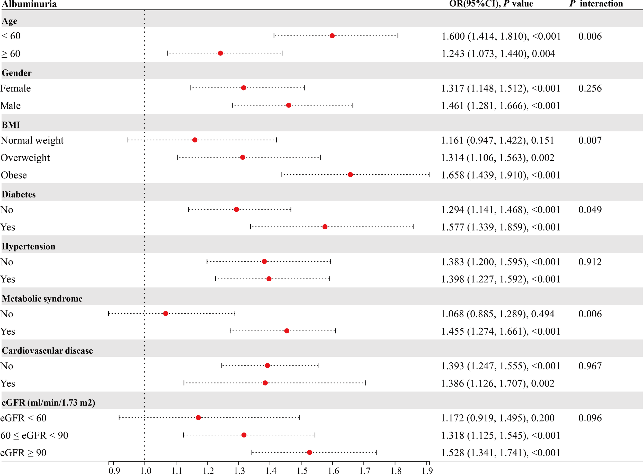A total of 9872 participants were included in this study, and the average TyG index was 8.53 ± 0.01. The proportion of albuminuria gradually increased with the increase of TyG index quartile interval. Elevated TyG index was independently associated with albuminuria, and this association persisted after additional adjustments for HOMA-IR or dichotomous metabolic syndrome. The area under the ROC curve (AUC) of TyG index was larger than that of log (HOMA-IR). Subgroup analysis suggested that the relationship between TyG index and albuminuria is of greater concern in age<60, overweight/obese, diabetic, and metabolic syndrome patients.