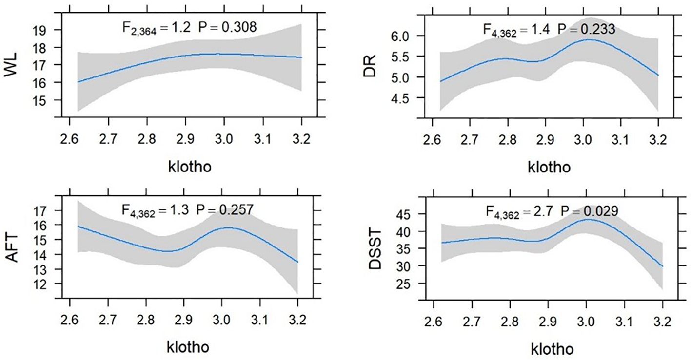 Higher level of serum Klotho were significantly associated with lower odds of cognitive impairment in patients with UACR > 30mg/g. Comparing to the quartile 2 group, patients in the quartile 3 group had higher scores of CERAD-WL and DSST. However, patients with a higher quartile of Klotho were not with a better cognitive function assessed by AFT. The associations between cognitive function test scores and Klotho are shown in Table 3, and there was no significant association between each cognitive test and serum Klotho regarded as a continuous variable. A non-linear association was found between Klotho and DSST score (shown in Figure 2).