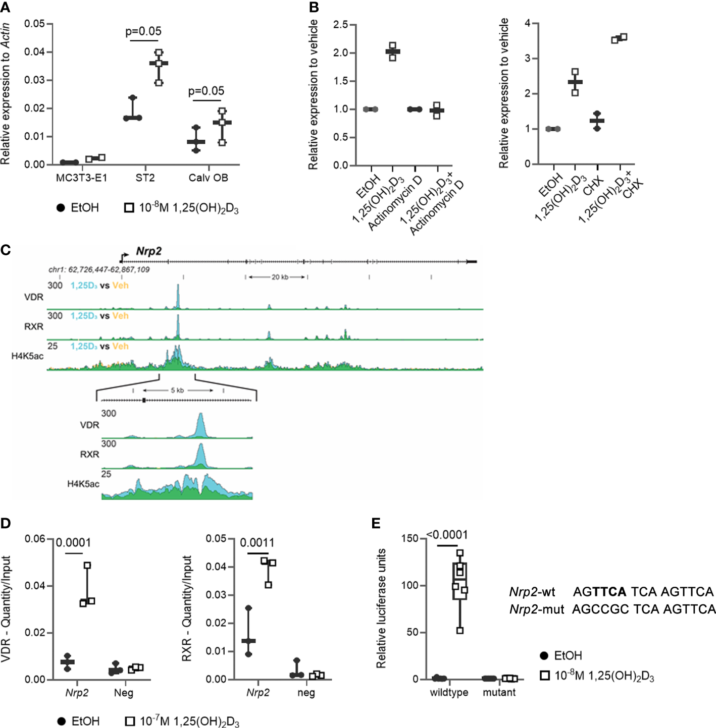 Nrp2 is a direct transcriptional target of 1,25(OH)2D3. (A)Nrp2 transcript levels are induced in MC3T3-E1 and ST2 osteoblast cell lines and in primary calvarial osteoblasts after treatment with 1,25(OH)2D3 (24 h, 10-8 M) (n=2-3). (B)Nrp2 transcript levels in MC3T3-E1 cells stimulated with 1,25(OH)2D3 (10-8 M) and treated with actinomycin D (5 µg/ml, 6 h) or cycloheximide (CHX) (100 ng/ml, 12 h) (n=2). (C) Overlaid triplicate and averaged ChIP-Seq tracks for VDR, RXR, and H4K5 acetylation (H4K5ac) where ethanol vehicle (Veh) are shown in yellow, 1,25(OH)2D3 treatment shown in blue, and overlapping data appear as green. Nrp2 genomic region displayed is chr1:62,726,447-62,867,109 with exons depicted as boxes, introns by arrows. Region of interest is highlighted in the inset below (chr1:62,765,185-62,770,248). Maximum height of tag sequence density for each data track indicated on the Y-axis (normalized to input and 107 tags). (D) ChIP-qPCR results confirmed the 1,25(OH)2D3-inducible association of VDR and RXR in response to treatment at the studied VDR binding site within the Nrp2 gene. ChIP was performed with chromatin samples from MC3T3-E1 cells incubated with 1,25(OH)2D3 (10-7 M) or vehicle for 3 h (n=3). (E) A DNA fragment, containing either the wildtype or a mutated, non-functional VDR binding site, was cloned and inserted into the pGL3-basic vector. Luciferase reporter gene assays were performed in exponentially growing MC3T3-E1 cells to evaluate the functionality of the identified VDR binding sites (10-8 M 1,25(OH)2D3, 24 h). Luciferase activity was normalized to that of empty pGL3-basic reporter vector (n=3). All results are expressed as mean and SEM. Two-tailed Student’s t-tests were performed to determine significant differences between 1,25(OH)2D3-treated and vehicle-treated cells.