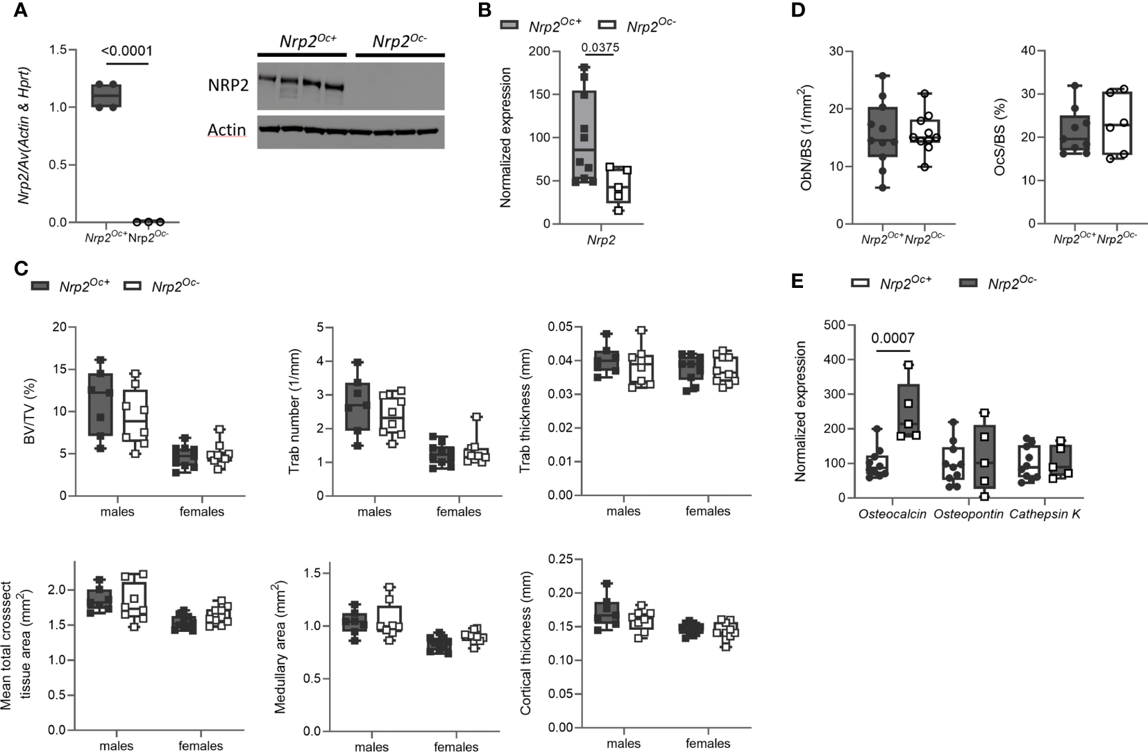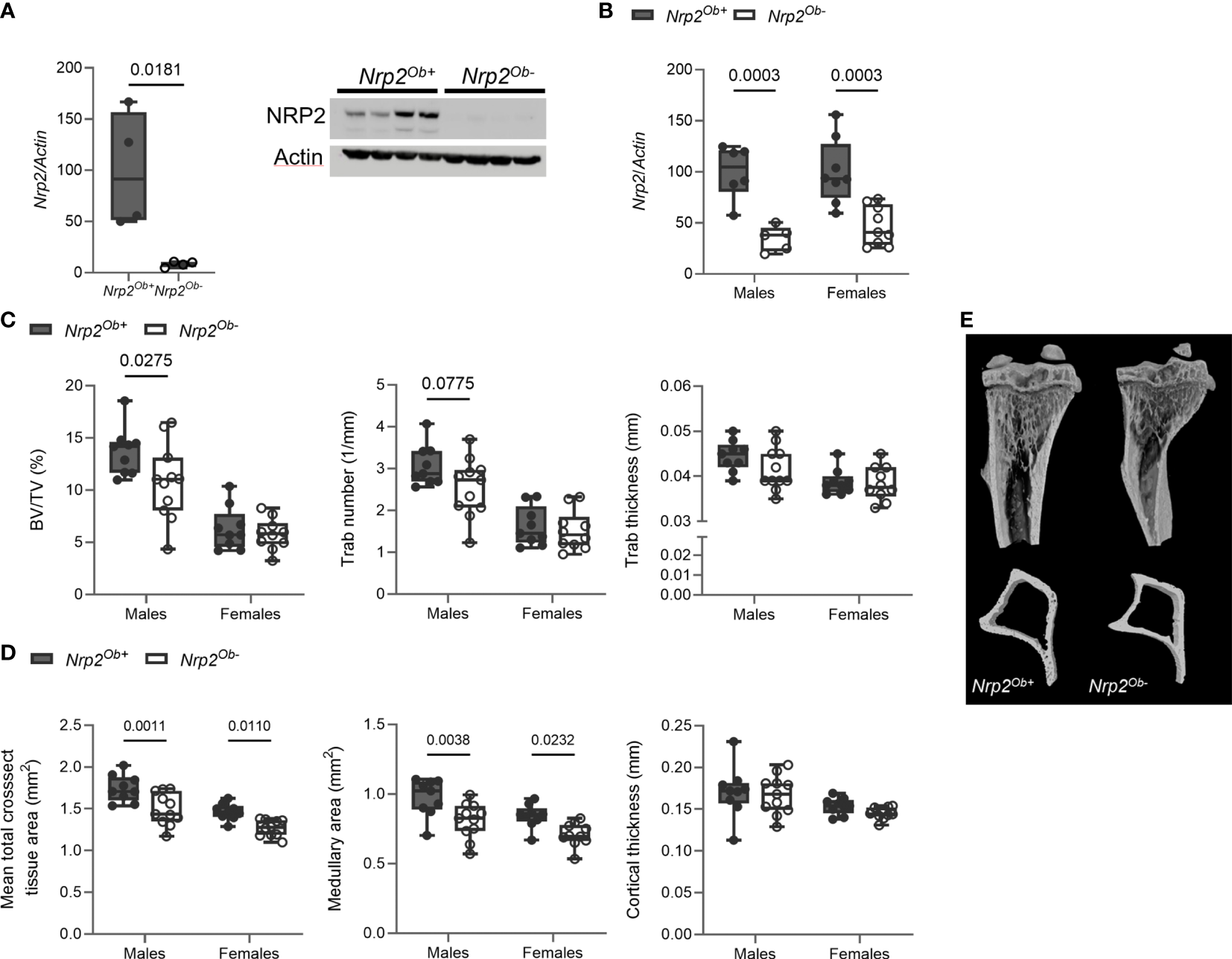 Our previous findings indicated that NRP2 expression is involved in normal bone homeostasis both in male (9) and female mice (Supplementary Figure 1). To investigate whether the effects of NRP2 were mediated systemically or rather by NRP2 expression specifically in bone cells, we deleted Nrp2 in osteoblasts and its progenitors (Nrp2Ob- mice) by crossing Prrx1-Cre mice with Nrp2lox/lox mice. NRP2 expression was significantly lower in primary calvarial osteoblasts isolated from Nrp2Ob- than from Nrp2Ob+ mice, confirming an efficient deletion of NRP2 in osteoblasts (Figure 2A). In addition, Nrp2 transcript levels were significantly lower in whole bone RNA extracts from Nrp2Ob- mice, compared to Nrp2Ob+ mice in both male and female mice (Figure 2B). Because the Prrx1 promoter targets osteochondroprogenitors, we also evaluated NRP2 expression in chondrocytes and adipocytes. Immunohistochemical analysis did not demonstrate NRP2 protein expression in chondrocytes (9). qPCR analysis of white adipose tissue (WAT) indicated that Nrp2 is expressed at low levels in adipocytes, however, no difference in Nrp2 expression was observed in WAT derived from Nrp2Ob+ and Nrp2Ob- mice (data not shown).