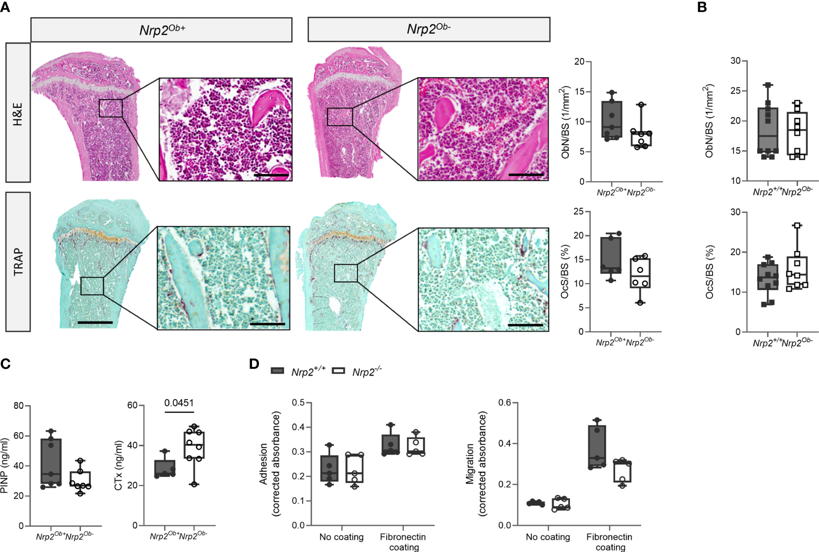 Despite the reduced trabecular bone mass in male Nrp2Ob- mice, bone histomorphometry revealed no differences in osteoblast number or in osteoclast surface between Nrp2Ob- mice and their wildtype littermates (Figure 3A). Also in female mice, histomorphometric analysis did not reveal any effect of Nrp2 deletion on osteoblast or osteoclast numbers (Figure 3B). Serum P1NP levels, a marker for osteoblast activity, tended to be slightly lower in male Nrp2Ob- mice, however, this difference did not reach significance (Figure 3C, left panel), whereas serum levels of CTx, a marker for osteoclast activity, were significantly increased in Nrp2Ob- mice (Figure 3C, right panel). Transcript analysis of whole bone homogenates from Nrp2Ob- mice and their wildtype littermates did not show any differences in expression of osteoblast (osteocalcin, osteopontin) or osteoclast (cathepsin K) markers in male or female mice (Supplementary Figures 2B, C). To investigate whether Nrp2 deletion in calvarial osteoblasts affected their intrinsic differentiation capacity, we performed in vitro mineralization studies. However, alizarin red staining and qPCR analysis did not show any differences in mineralization efficacy of osteoblasts derived from Nrp2Ob- mice or from their wildtype littermates (Supplementary Figure 3). Finally, as NRP2 can act as a coreceptor for different semaphorin ligands, which are involved in the regulation of cell adhesion and migration, we evaluated whether osteoblastic Nrp2 deletion affected their adhesive and migratory capacity. As can be observed in Figure 3D, fibronectin coating enhanced cell adhesion and induced cell migration, however, to the same extent for Nrp2+/+ and Nrp2-/- osteoblasts. Similar results were obtained for vitronectin coating (data not shown).
