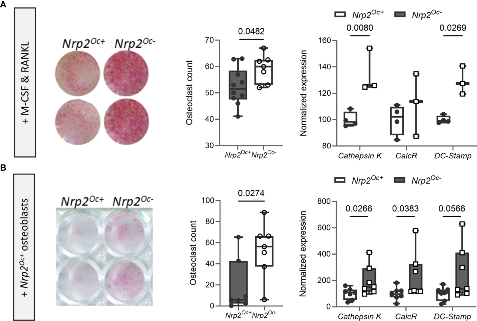 Previous research from our group demonstrated that systemic Nrp2 deficiency is associated with an increased osteoclast number in bone and that hematopoietic cells derived from Nrp2-/- mice differentiate more efficiently into osteoclasts (9). We therefore examined whether Nrp2 deletion specifically in osteoclasts and its precursors (Nrp2Oc- mice) affected osteoclast formation and bone homeostasis by crossing Nrp2lox/lox mice with LysM-Cre mice. Osteoclasts, generated by culturing hematopoietic cells from Nrp2Oc- mice in the presence of M-CSF and RANKL, did not express NRP2 transcript or protein, confirming an efficient NRP2 deletion in osteoclasts (Figure 4A). In addition, Nrp2 transcript levels were significantly reduced in RNA extracts of whole bone homogenates from Nrp2Oc- mice (Figure 4B). However, this substantial reduction in osteoclastic Nrp2 expression did not affect bone homeostasis in male nor female mice as µCT analysis did not reveal any differences in trabecular or cortical bone mass, nor in cross-sectional bone area between 8-week-old Nrp2Oc+ and Nrp2Oc- mice (Figure 4C). Also at 16 weeks of age, no differences in bone mass between female Nrp2Oc+ and Nrp2Oc- mice were observed (Supplementary Figure 4). Concordantly, bone histomorphometry did not show differences in osteoblast number or osteoclast surface between Nrp2Oc+ and Nrp2Oc- mice in females (Figure 4D). Rather surprisingly, transcript levels of osteocalcin were significantly elevated in female Nrp2Oc- mice compared to their control littermates, whereas the expression of other osteoblast (osteopontin) or osteoclast (cathepsin K) markers was not different (Figure 4E). In contrast to the in vivo findings, in vitro osteoclast cultures showed that osteoclast numbers and expression of osteoclast markers were increased when hematopoietic cells of Nrp2Oc- origin were used, whether cultured in the presence of M-CSF and RANKL or cocultured with calvarial osteoblasts (Figures 5A, B).