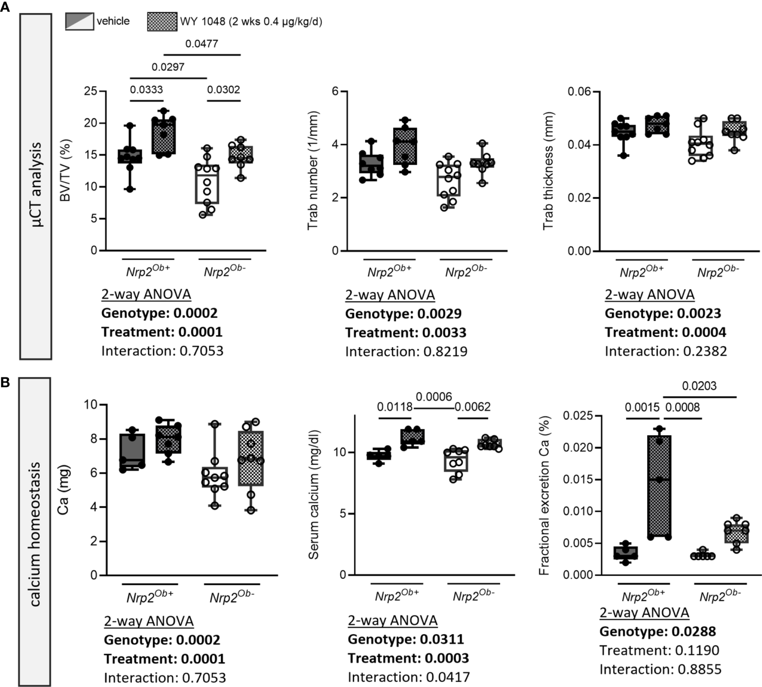 Short-term treatment with the vitamin D analog WY 1048 increases bone mass similarly in both genotypes. (A) µCT analysis and evaluation of trabecular bone parameters in femurs of 10-week-old male Nrp2Ob- and Nrp2Ob+ mice, which were treated daily for 2 weeks with 0.4 µg/kg WY 1048 or vehicle (n=7-8). (B) Calcium content in bone, levels in serum, and renal fractional excretion in 10-week-old male Nrp2Ob- and Nrp2Ob+ mice, treated daily with 0.4 µg/kg WY 1048 or vehicle during 2 weeks (n=5-9). All data are expressed as mean and SD. Two-way ANOVA analysis, with genotype and treatment as independent variables, followed by Sidak’s multiple comparisons test was performed to detect significant differences between Nrp2Ob+ and Nrp2Ob- mice and to evaluate the effect of the treatment.