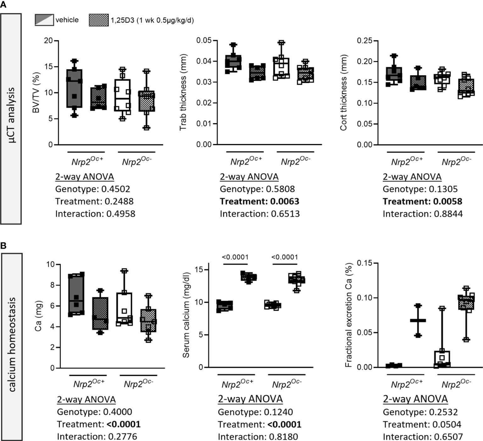 Short-term treatment with 1,25(OH)2D3 does not affect bone differently in Nrp2Oc- mice and their wildtype littermates. (A) µCT analysis and evaluation of trabecular and cortical bone parameters in femurs of 10-week-old male Nrp2Oc- and Nrp2Oc+ mice, which were treated daily for 1 week with 0.5 µg/kg 1,25(OH)2D3 or vehicle (n=7-8). (B) Calcium content in bone, serum, and urine in 10-week-old male Nrp2Oc- and Nrp2Oc+ mice, daily treated with 0.5 µg/kg 1,25(OH)2D3 or vehicle during 1 week (n=5-9). All data are expressed as mean and SD. Two-way ANOVA analysis, with genotype and treatment as independent variables, followed by Sidak’s multiple comparisons test was performed to detect significant differences between Nrp2Oc+ and Nrp2Oc- mice and to evaluate the effect of the treatment.
