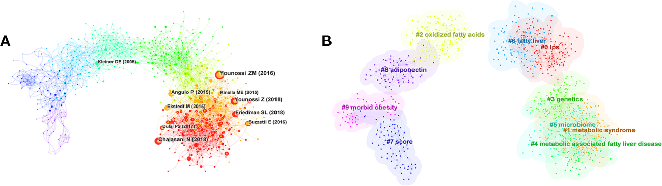(A) CiteSpace co-citation map of references involved in inflammation and fibrogenesis in MAFLD. The first authors of the top 10 most co-cited references are presented. (B) Clustered networks of the co-citation analysis of the investigated reference and the 2348 citing articles via CiteSpace. The top 10 largest clusters are shown.