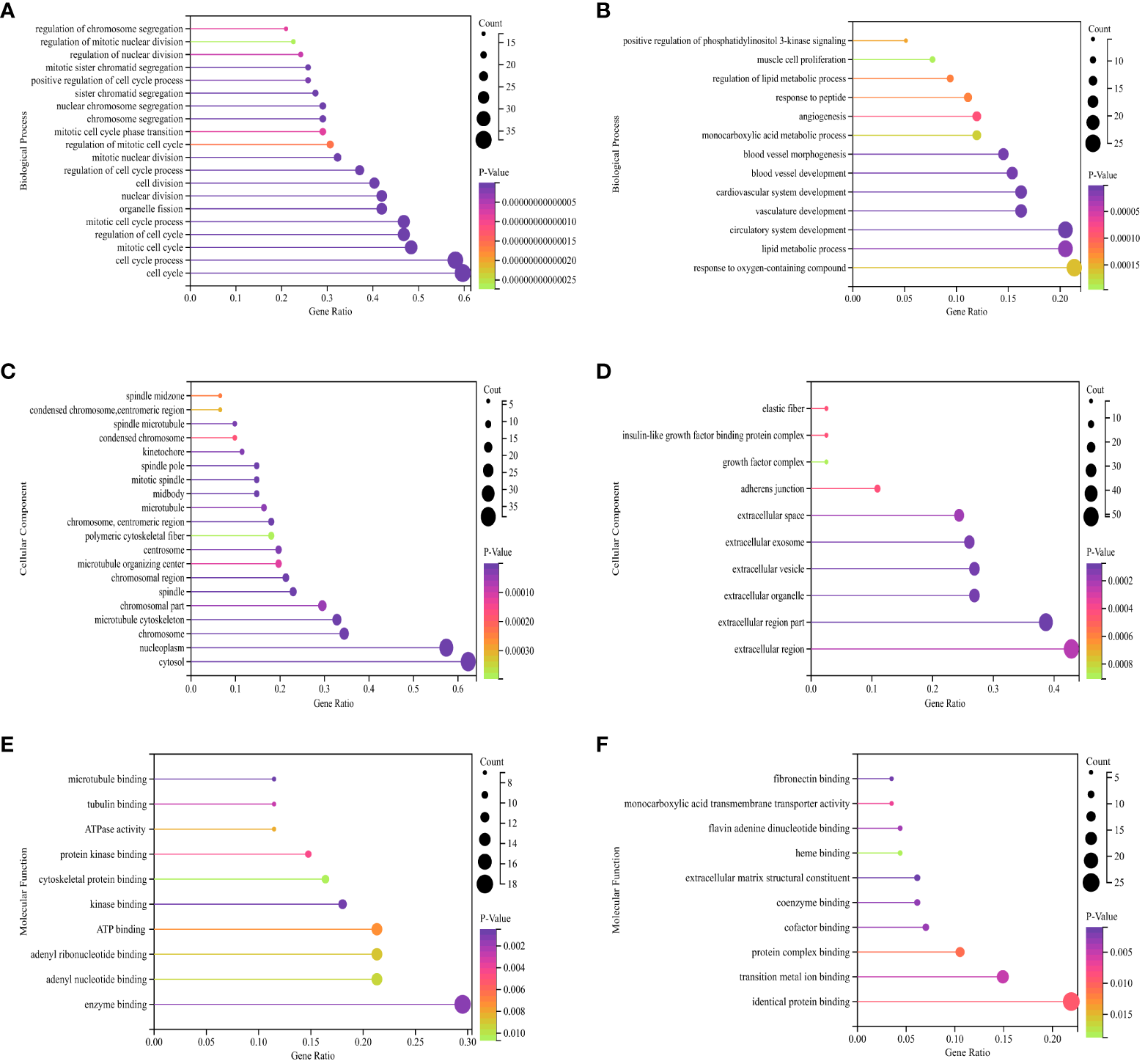 GO (Gene Ontology) pathway enrichment analyses of DEGs (differentially expressed genes). (A) Biological process for up-regulated DEGs. (B) Biological process for down-regulated DEGs. (C) Cellular component for up-regulated DEGs. (D) Cellular component for down-regulated DEGs. (E) Molecular function for up-regulated DEGs. (F) Molecular function for down-regulated DEGs. The X-axis represents the ratio of enriched pathways to total pathways, while the Y-axis displays the names of enriched pathways. “Count” indicates the number of enriched pathways, which corresponds to the size of the dot. The color indicates the P-value, with darker shades indicating smaller P-value.