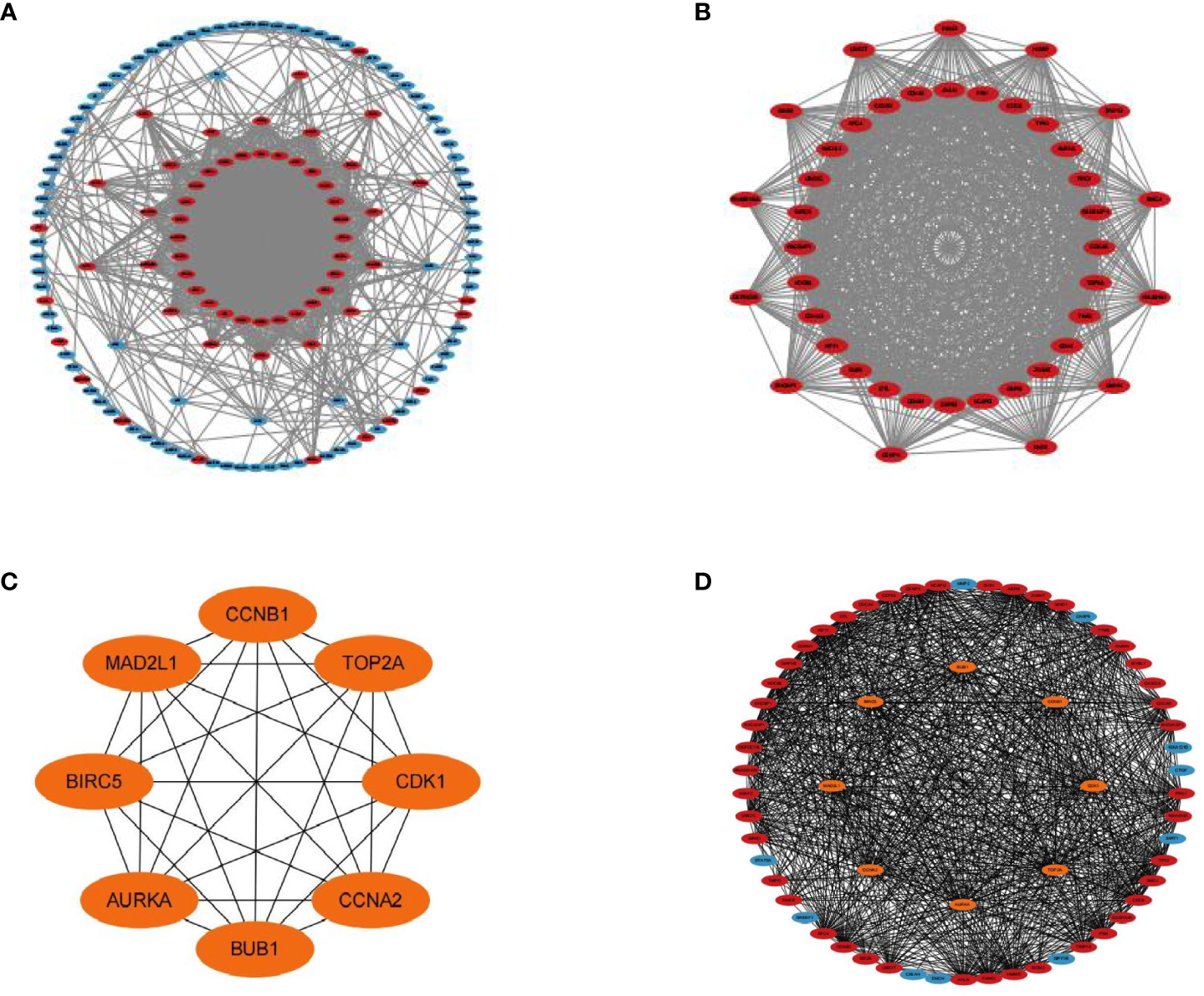PPI networks of DEGs. (A) Up-regulated and down-regulated genes in PPI network (red nodes mean up-regulated genes, and blue nodes mean down-regulated genes). (B) The most significant module in PPI network. (C) Hub genes in PPI network. (D) Hub genes and other genes in PPI network (orange nodes mean hub genes).